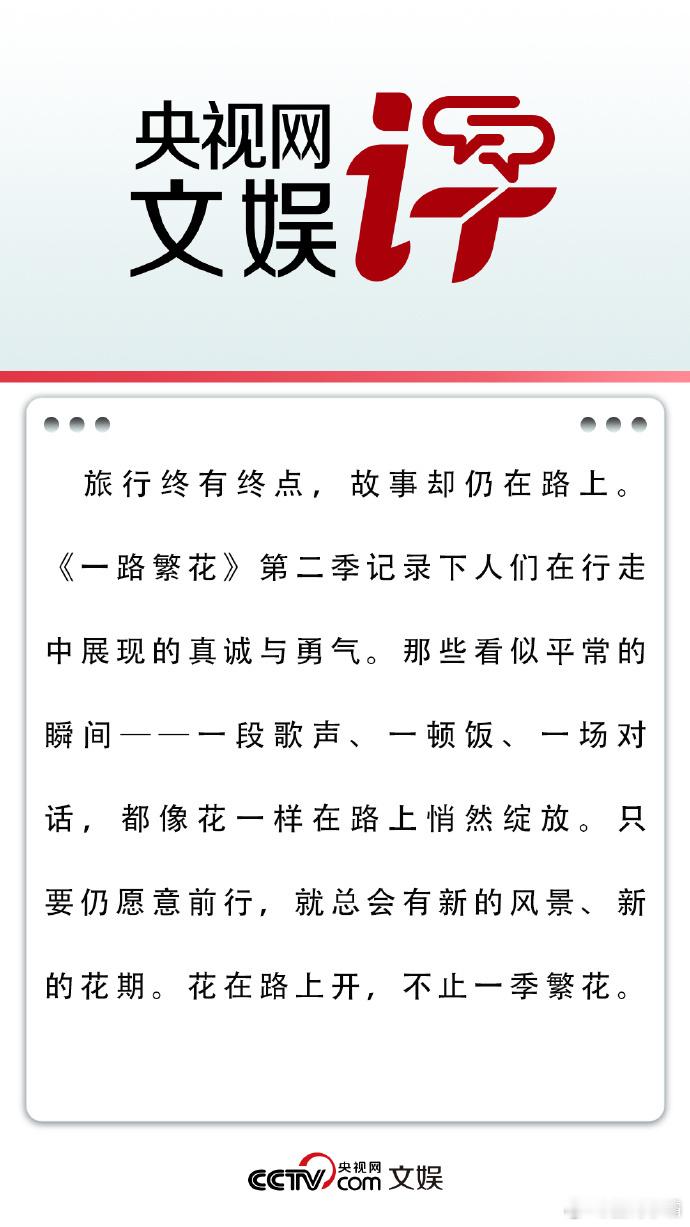 央视网文娱评一路繁花第二季一路繁花 看完只想说“这才是旅行综艺该有的样子”!没有套路,只有嘉宾们真实的笑与慌,无龄盛放的状态、有温度的细节,让人觉得前行就有新风景~
