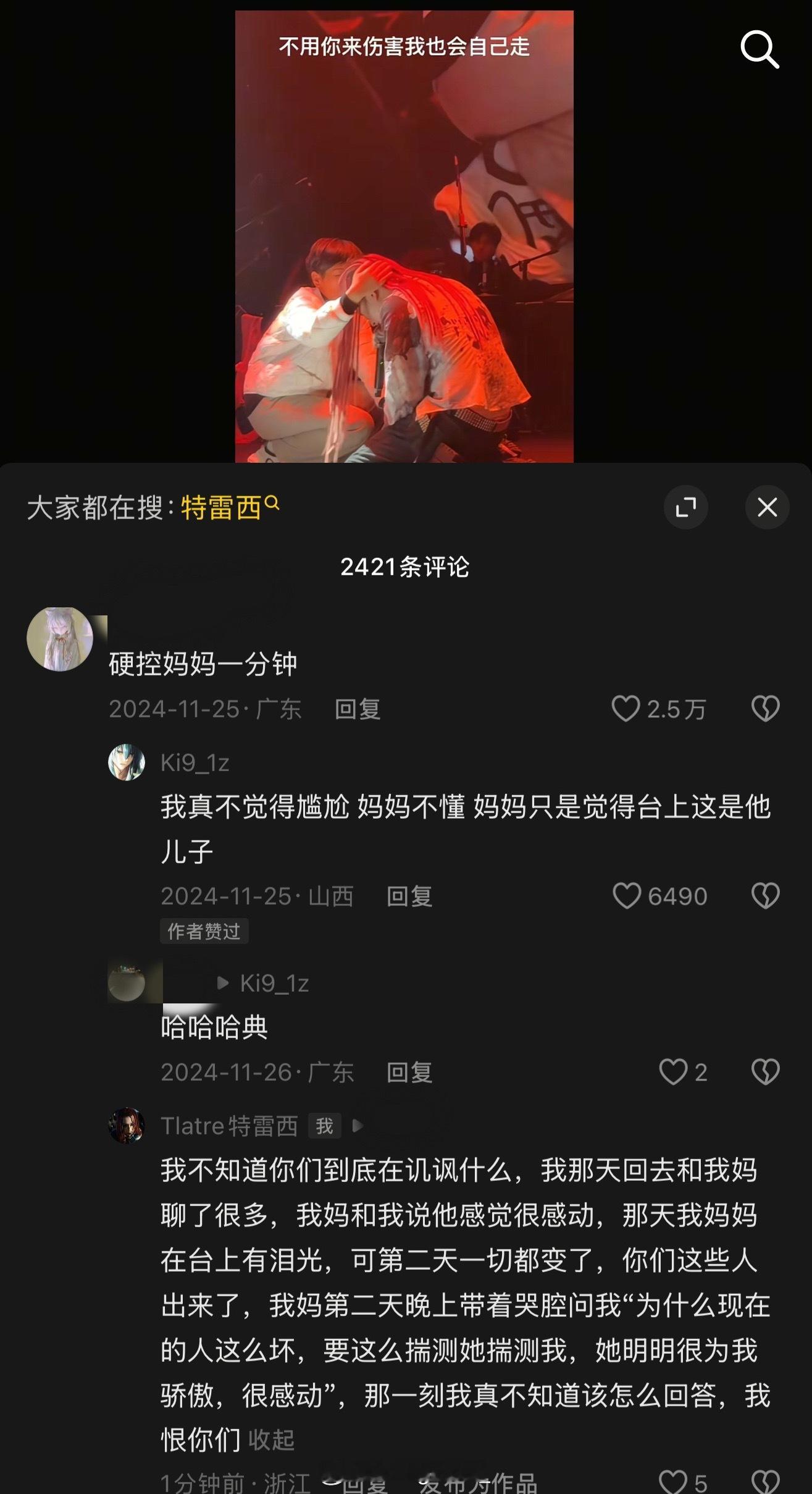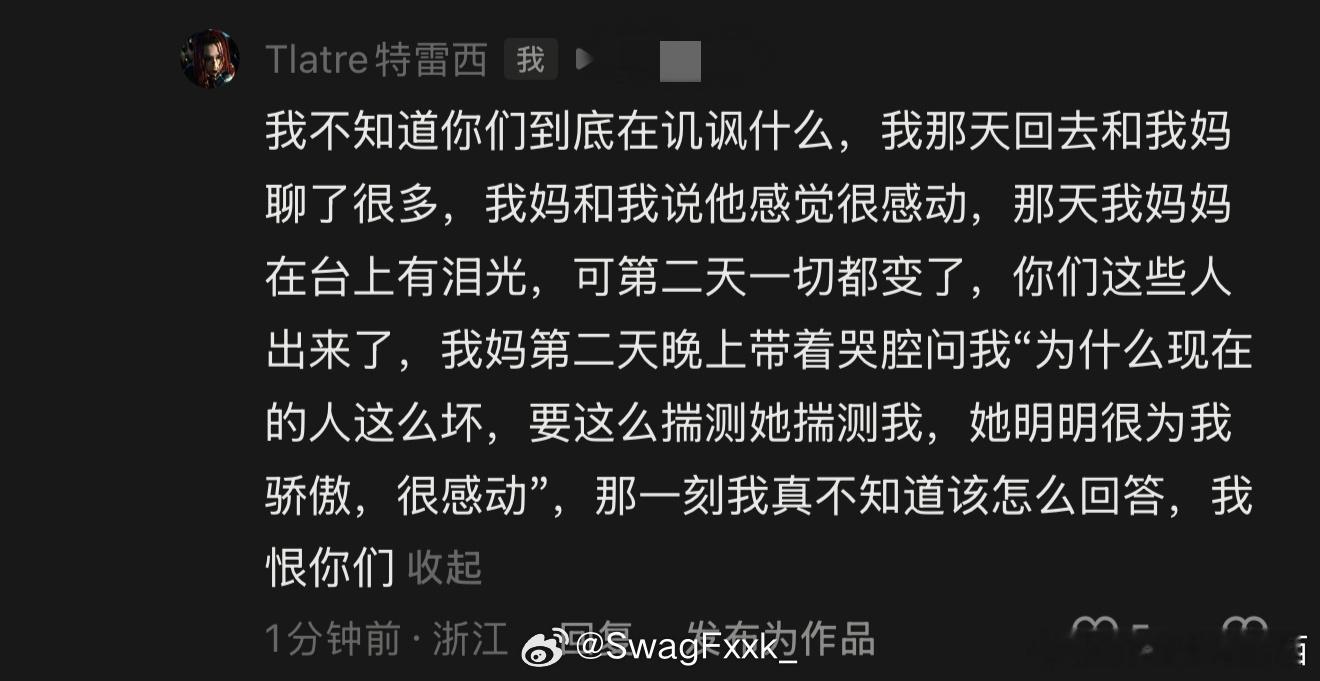 离谱!特雷西曾经在演出时走心和妈妈同台,却在评论区被嘲讽。特雷西时隔一年对此回复