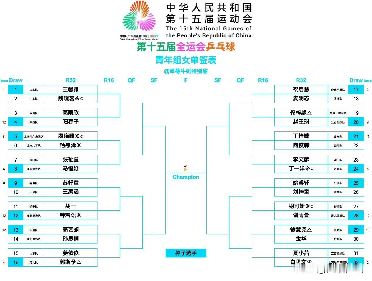 第十五届全国运动会丨青年组女单签表 【1/8区】王馨雅(山东队)🆚魏璟茗※○(广东队)、高雨欣(四川队)🆚阳春子(陕西队) 【2/8区】廖晓晴※○(上海地产集团队)🆚杨惠泽※(北京八喜队)、张祉萱(澳门队)🆚马恒妤(江苏挺拔队) 【3/8区】苏籽童(香港队)🆚王禹涵(天津队)、胡一(辽宁队)🆚钟若语※(江苏挺拔队) 【4/8区】高艺頔(四川队)🆚孙思楠(湖北体彩队)、姜依依(山东队)🆚郭斯予△(河北队) 【5/8区】祝启慧(北京八喜队)🆚麦明芯(香港队)、佟梓缘△(黑龙江银河队)🆚赵王琪(江苏挺拔队) 【6/8区】丁怡婕(山东队)🆚向俊霖(四川队)、李文彦(澳门队)🆚丁一洋※○(河北队) 【7/8区】姚睿轩(河北队)🆚刘梓童(山东队)、胡可妍※○(浙江队)🆚谢雨萱(湖北体彩队) 【8/8区】徐慧尧△(陕西队)🆚金华(广东队)、夏小茜(江苏挺拔队)🆚白思文※(上海地产集团队) 2025.11.5