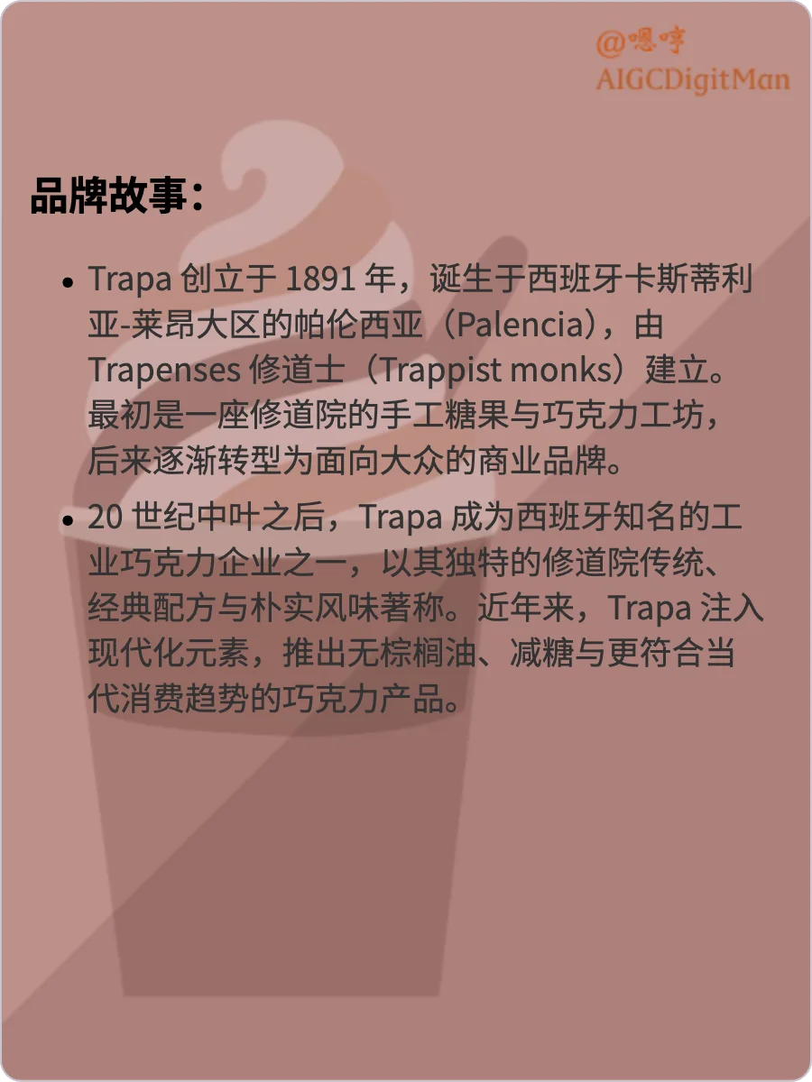 20 世纪中叶之后,Trapa 成为西班牙知名的工业巧克力企业之一,以其独特的修道院传统、经典配方与朴实风味著称。