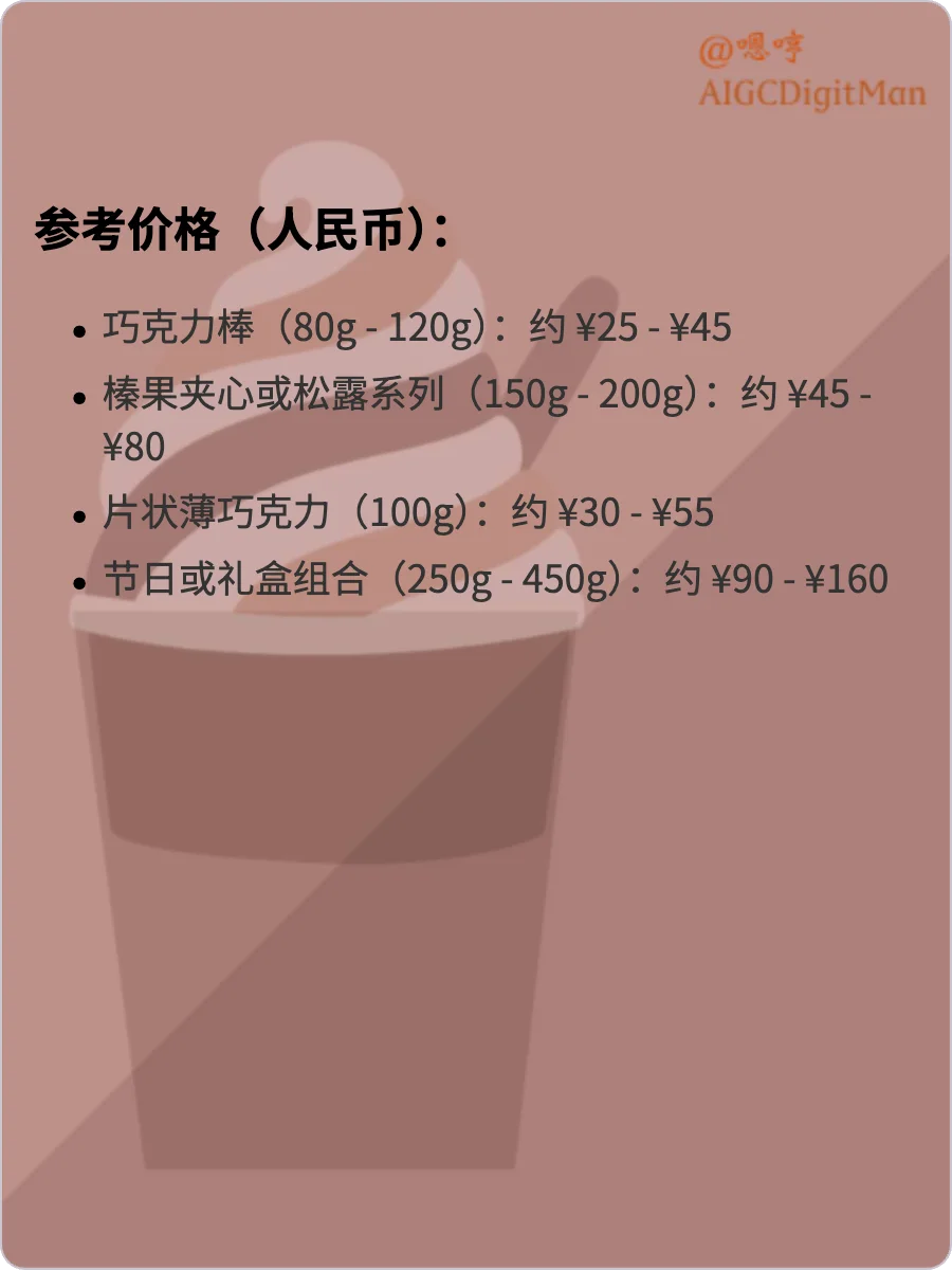 巧克力棒(80g - 120g):约 ¥25 - ¥45