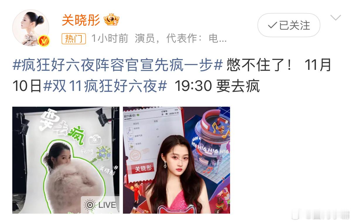 关晓彤憋不住了11月10日要去疯双11疯狂好六夜 关晓彤的双11舞台总是充满惊喜,这次官宣这么有趣,舞台更是值得期待!期待她带来一个又酷又炸的表演,绝对精彩!