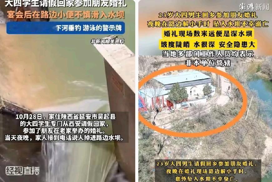 23岁大学生参加朋友婚礼, 路边解手掉进水坝溺亡, 这事看得人心里揪得慌! 农村培养一个大学生多不容易,父母盼了二十多年,却以这样的方式阴阳两隔。 弟弟说天黑看不清警示牌,水坝连防护栏都没有,可网友吵翻了天—— 有人说该怪相关部门甩锅,安全措施不到位;也有人说成年人该懂危险,放着婚宴厕所不上,自己选了偏僻地方。 其实这事哪是单方面的错?相关部门的安全保障不能缺位,成年人的自我防护也不能少。 最让人寒心的是,出事之后各部门互相推脱,没谁先想着解决问题。 一条年轻生命没了,再多争论也换不回团圆。你觉得这事该怪谁?坠河溺亡 青年溺亡