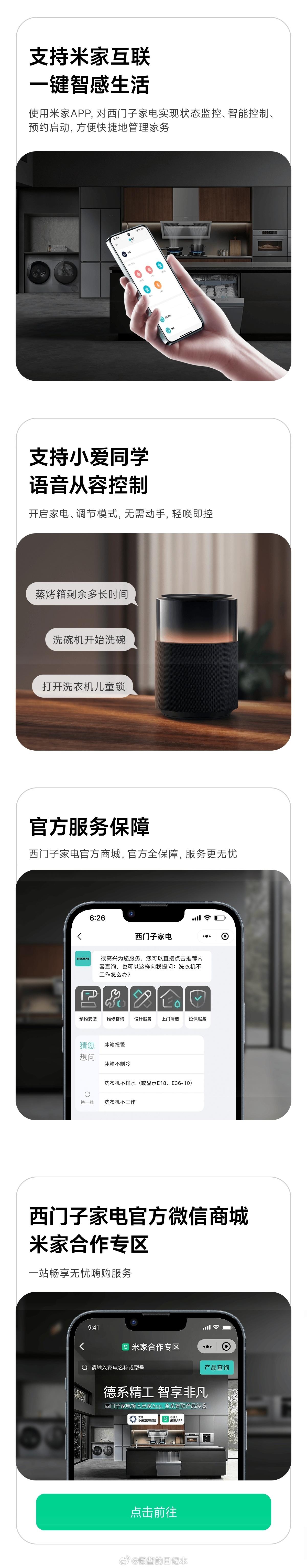 用户可使用米家 App 对西门子家电进行状态监控、智能控制、预约启动,从而便捷管理家务;通过小爱同学来开启家电、调节模式,设备能够响应“蒸烤箱剩余多长时间”“洗碗机开始洗碗”“打开洗衣机儿童锁”等语音指令。