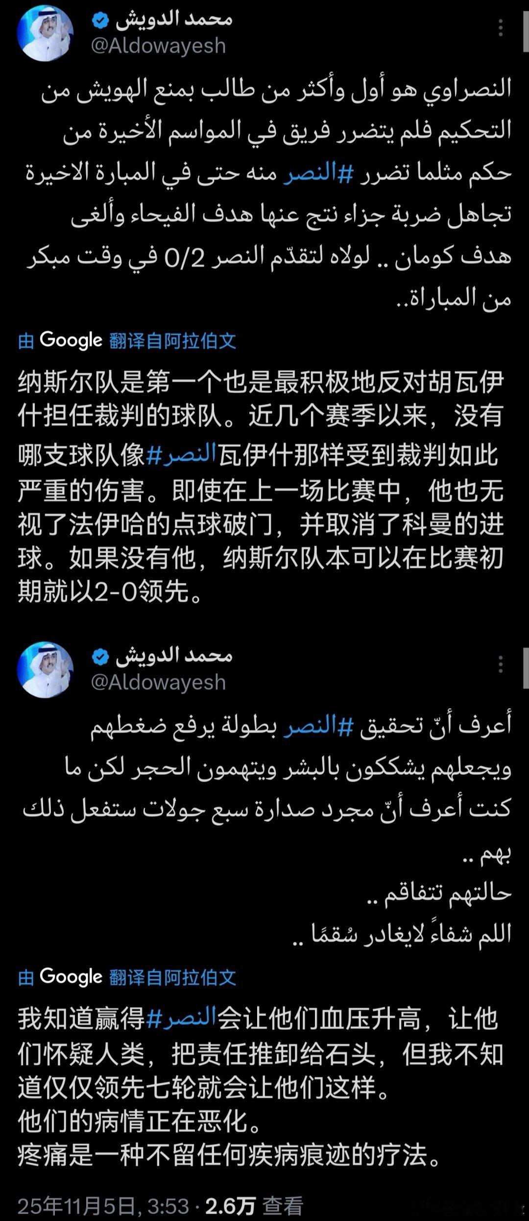 “利雅得胜利是最早就抵制胡维什的球队,不是他的话,利雅得胜利早就 2-0 领先了。”