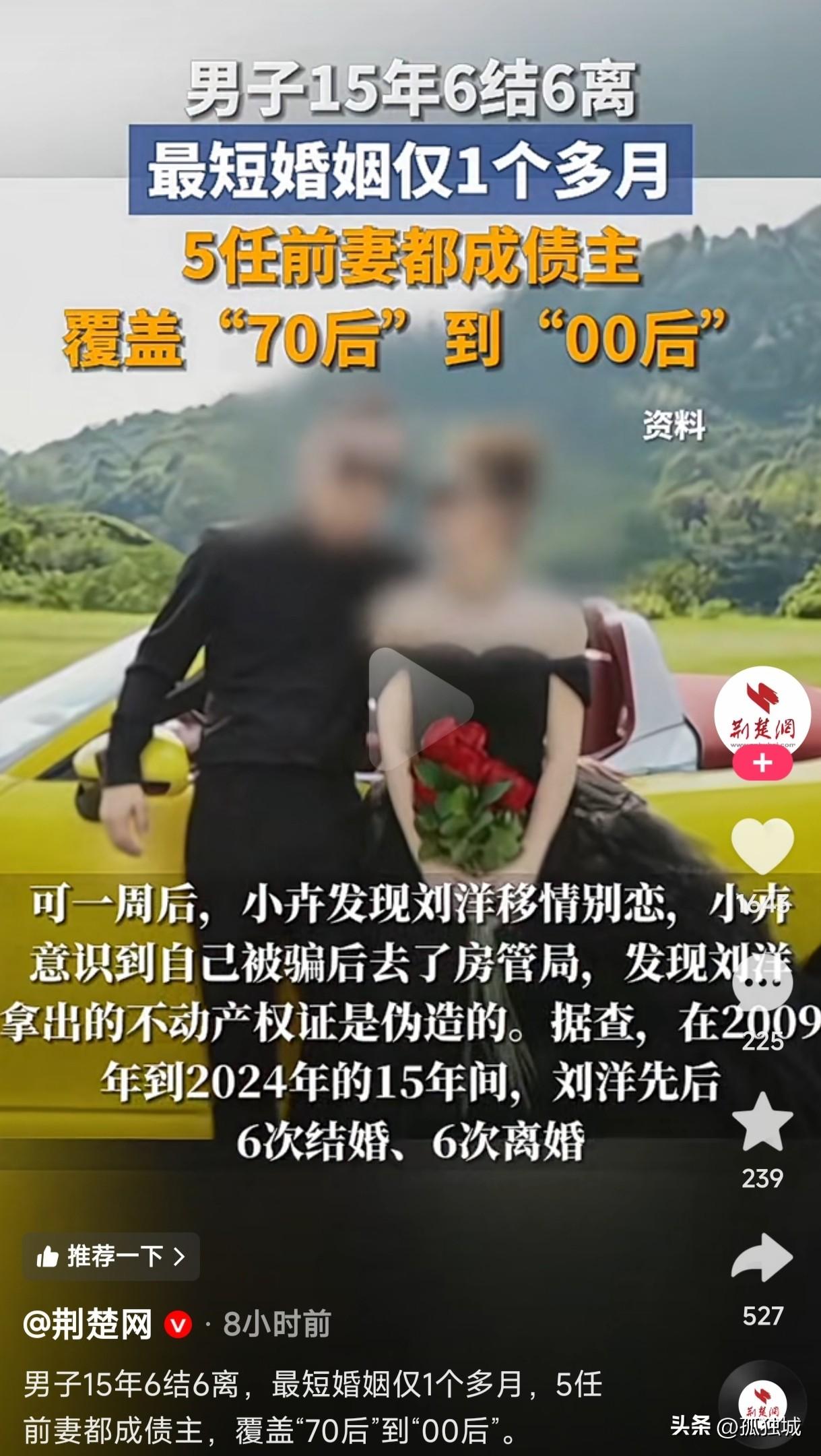 这男子是不是骗婚界天花板级别的人了,15年时间6离6结,而且5任前妻都成了债主,