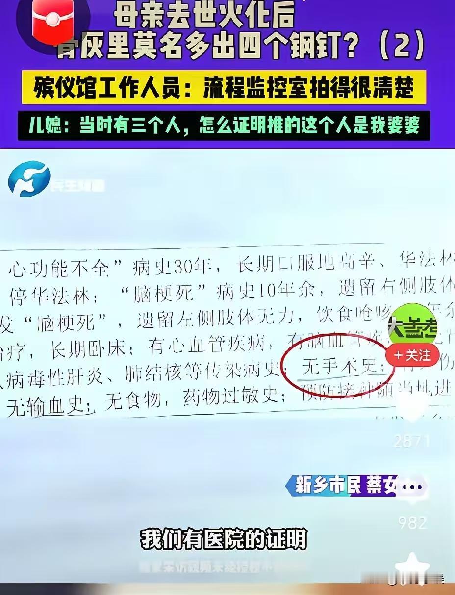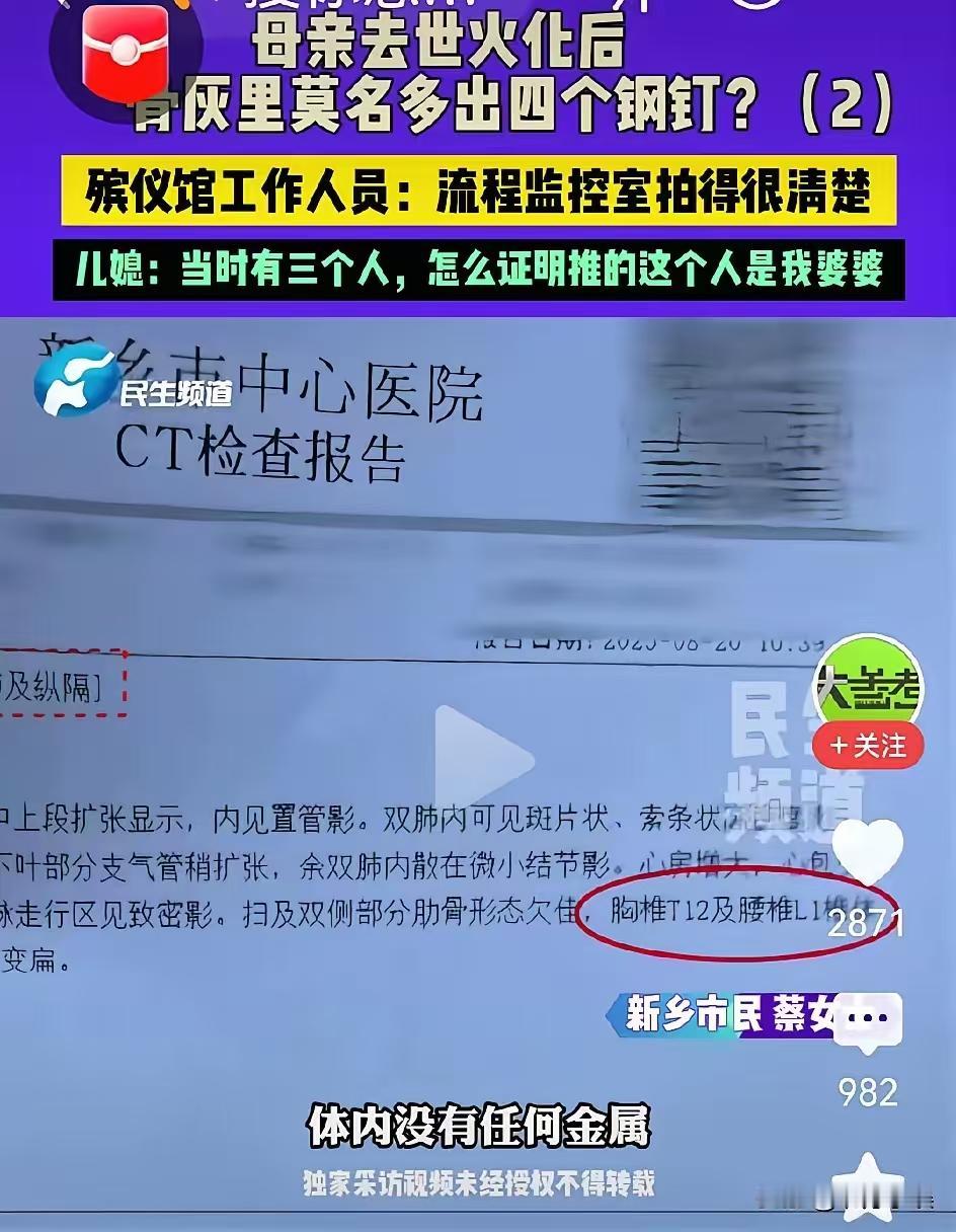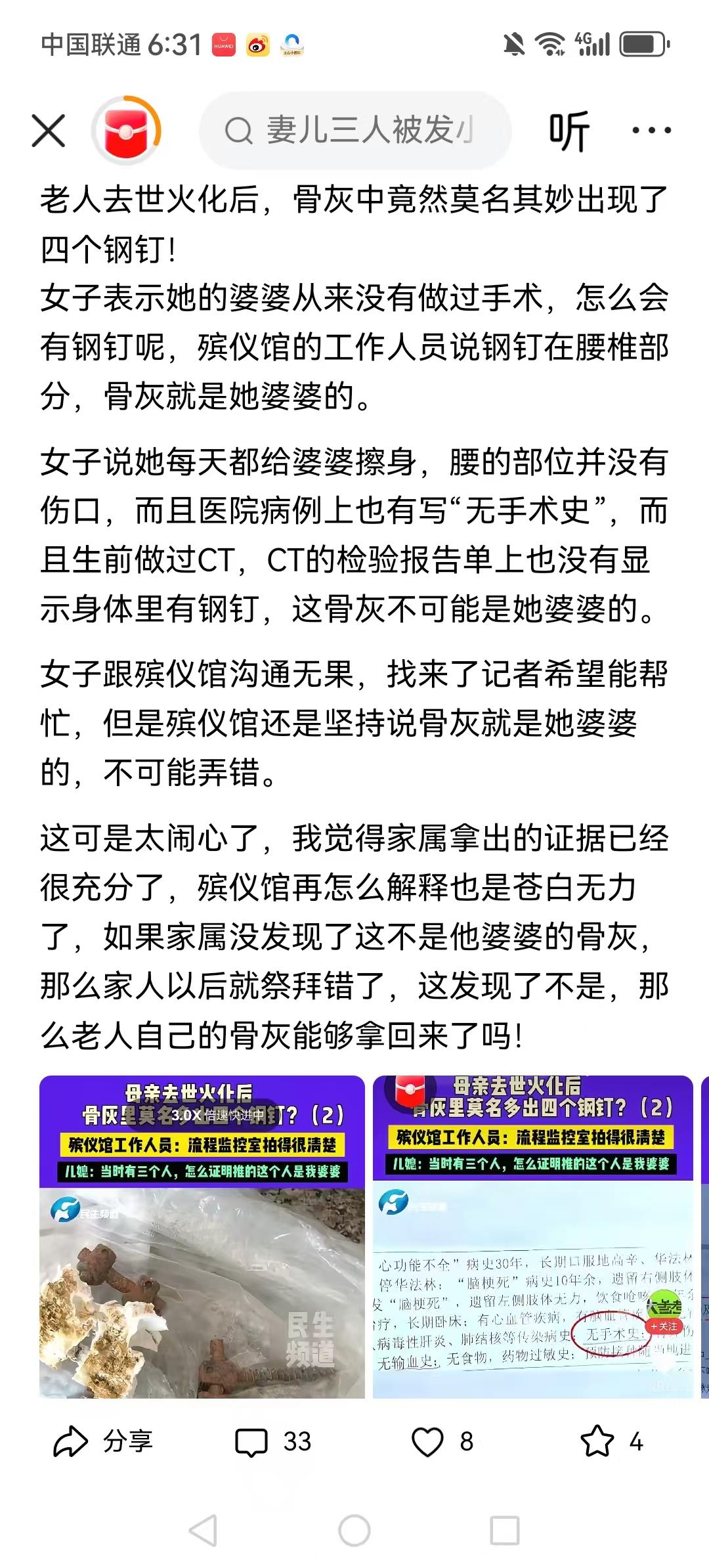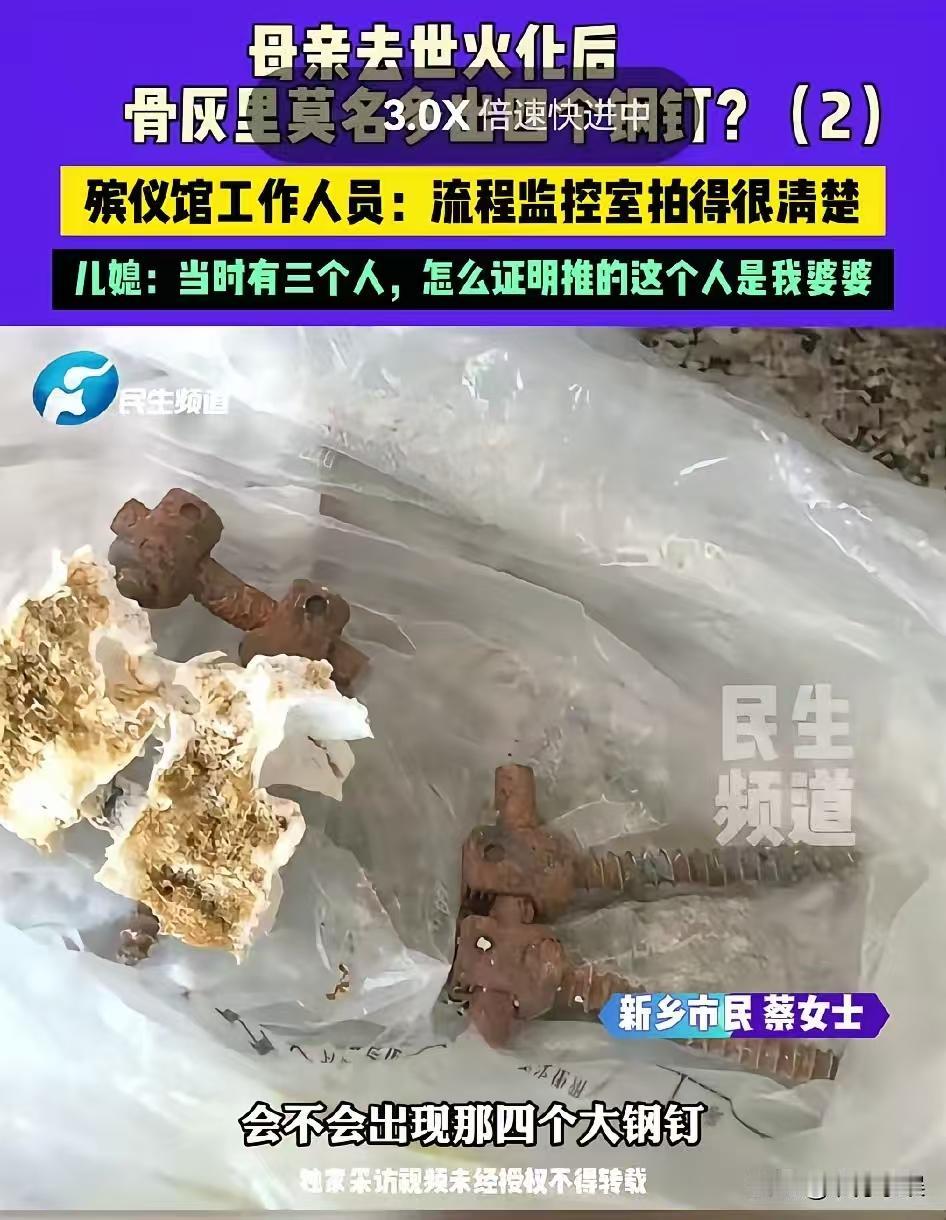 老人去世火化后,骨灰中竟然莫名其妙出现了四个钢钉!非常简单。如果是当天火化的骨灰,查一下哪个先人生前做过这种骨折后的手术(估计先人生前应该是坐轮椅),不就结了么?这是两个人的骨灰搞错了。 是的,里面不可能扫干净,有前面残留的很正常。 都在一个炉里火花然后铲一盒灰给你,你说这灰是不是都是你家的。 殡仪馆不承认自己有错,就是不愿意赔偿损失。普通炉都是混着烧的,豪华炉单独烧贵。