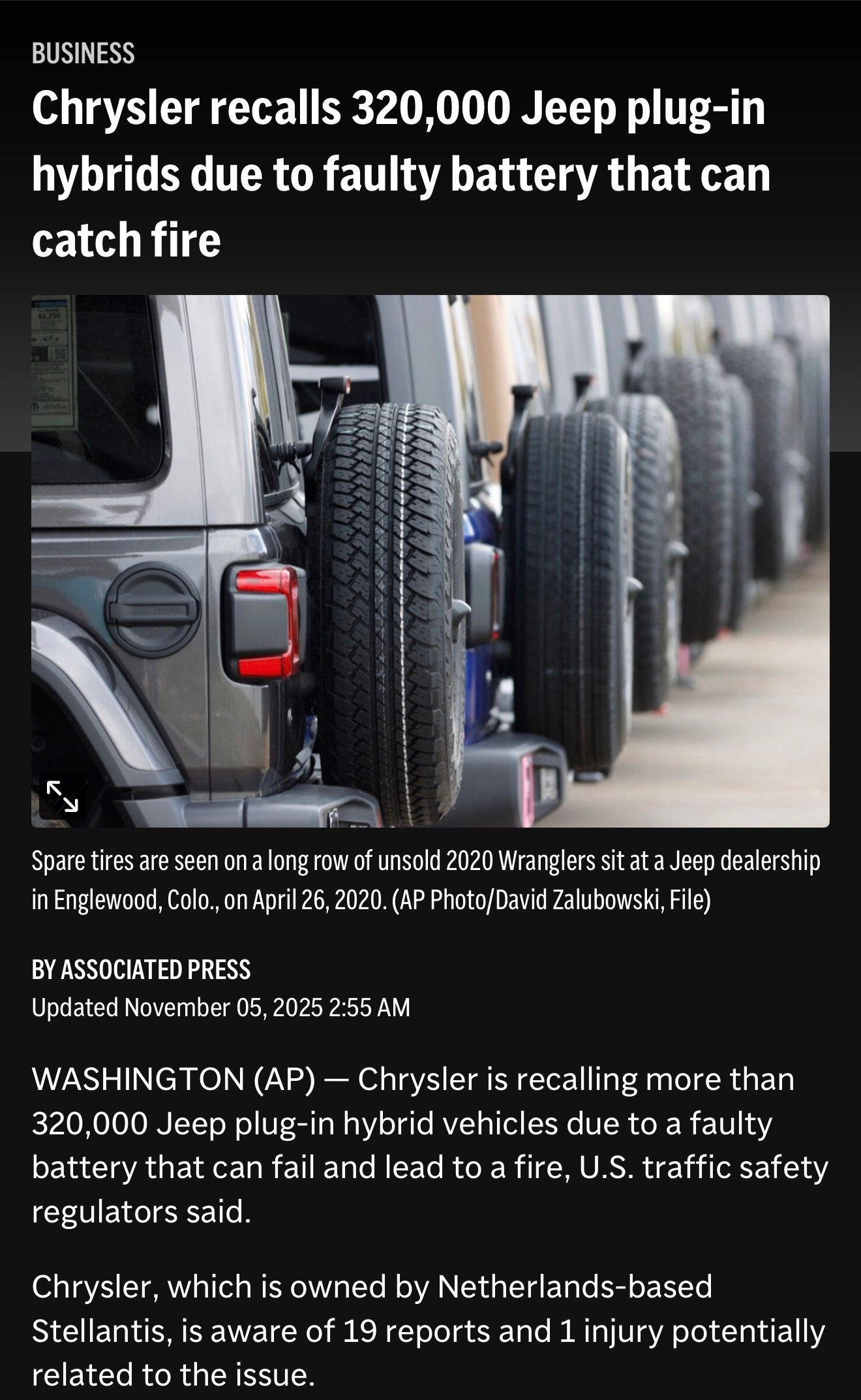 斯特兰蒂斯宣布,针对JEEP品牌旗下的插电混动产品进行召回,涉及美国市场的32万辆JEEP产品: