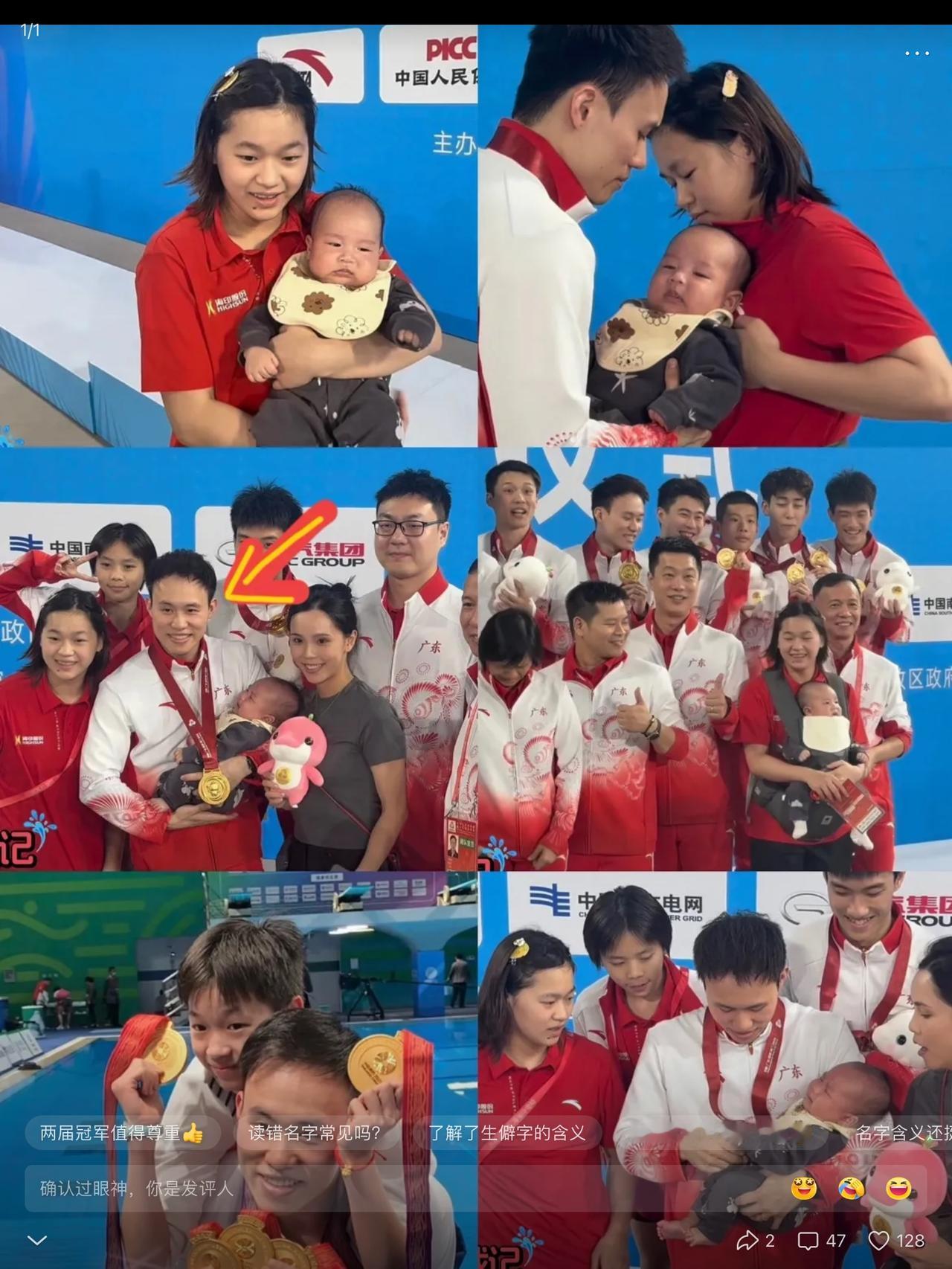 全红婵是个十全人。 就是爸爸妈妈爷爷奶奶外公外婆兄弟姐妹都有。才能叫十全人。 全红婵抱得是谢思埸的娃娃, 谢思埸的埸,你认识吗? 我一开始读杨,后来打字的时候发现打不出来。本着不认识读半边的思路,找了半天才找到这个埸字。第二次就靠前了,还好还好。 男子跳水没怎么关注,我也不知道他的冠军是体操还是跳水。我觉得他还没有他的娃娃🔥火。这两天全红婵抱着他孩子满场跑,抱着娃娃跟大家合影,好可爱。 取名字还是要避开生僻字,你不能等着读错了的人多了专家给你改读音吧!哈哈😄全红婵