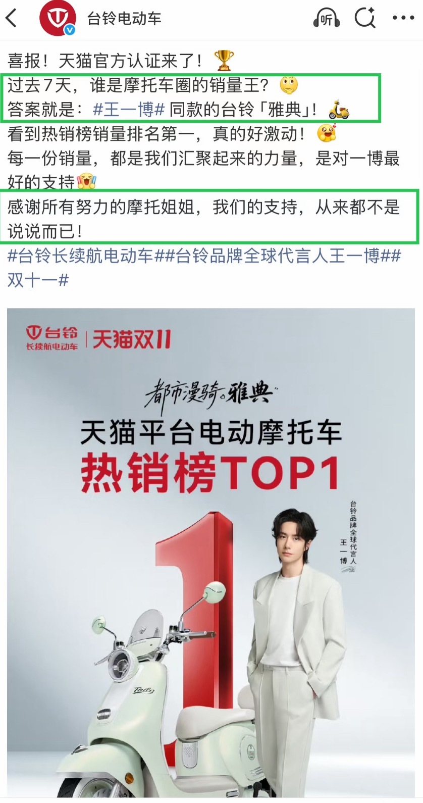 王一博台铃战报,品牌都来感谢摩托姐姐了,实打实的销售量[奶牛猫]