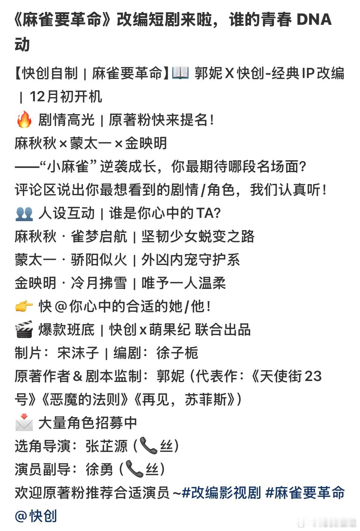 [泪奔]哦买噶时代的眼泪! 麻雀要革命要拍成短剧了! 12月初快创拍! 嗯天使