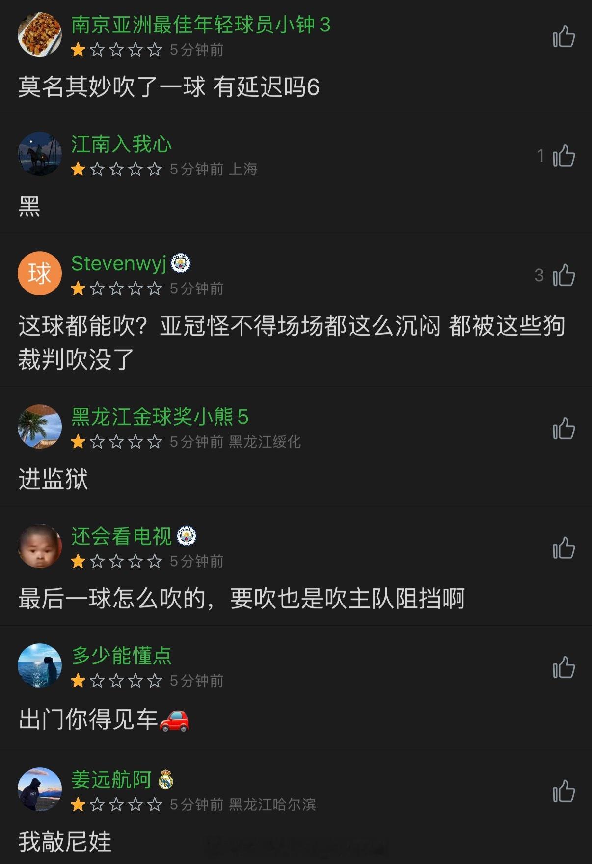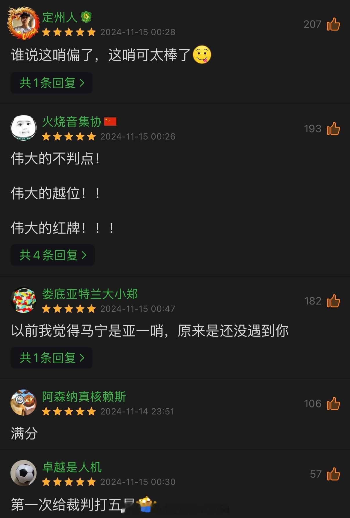 一个不能再明显的亚洲官哨,在吹完泰山1-2横滨、申花2-2新鹏城、国足1-0巴林和申花1-3柔佛之后的评分区评论——