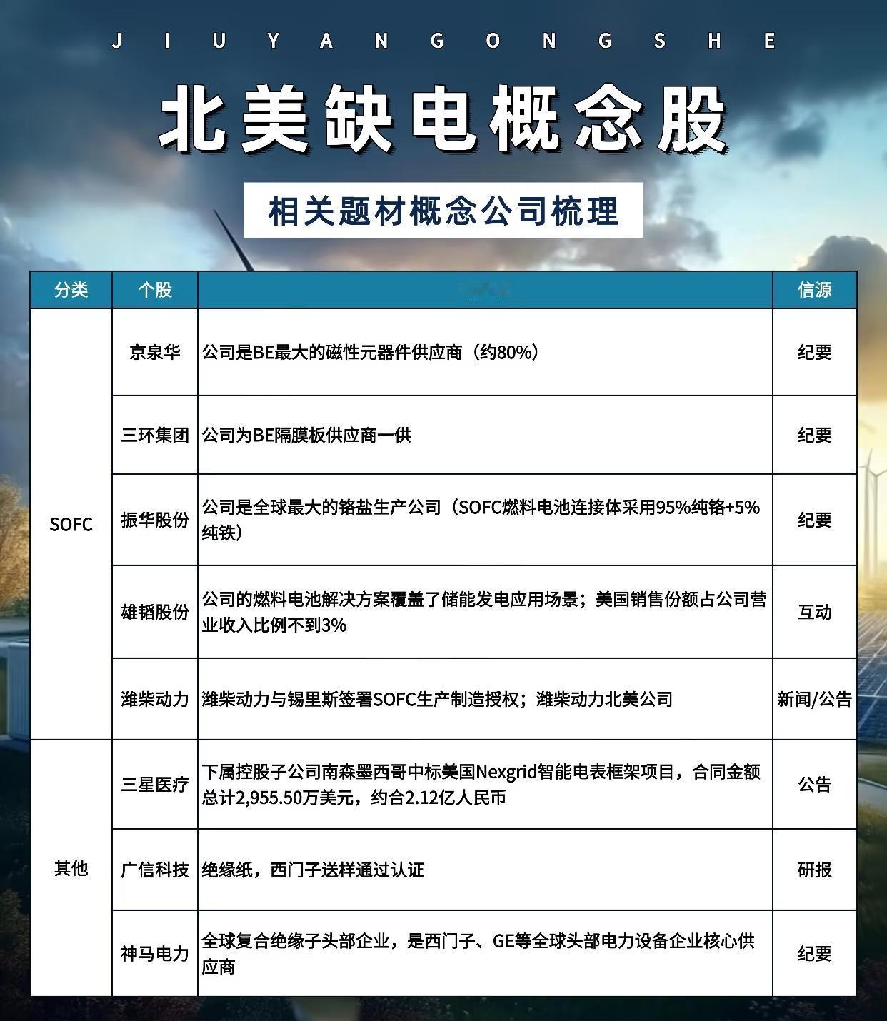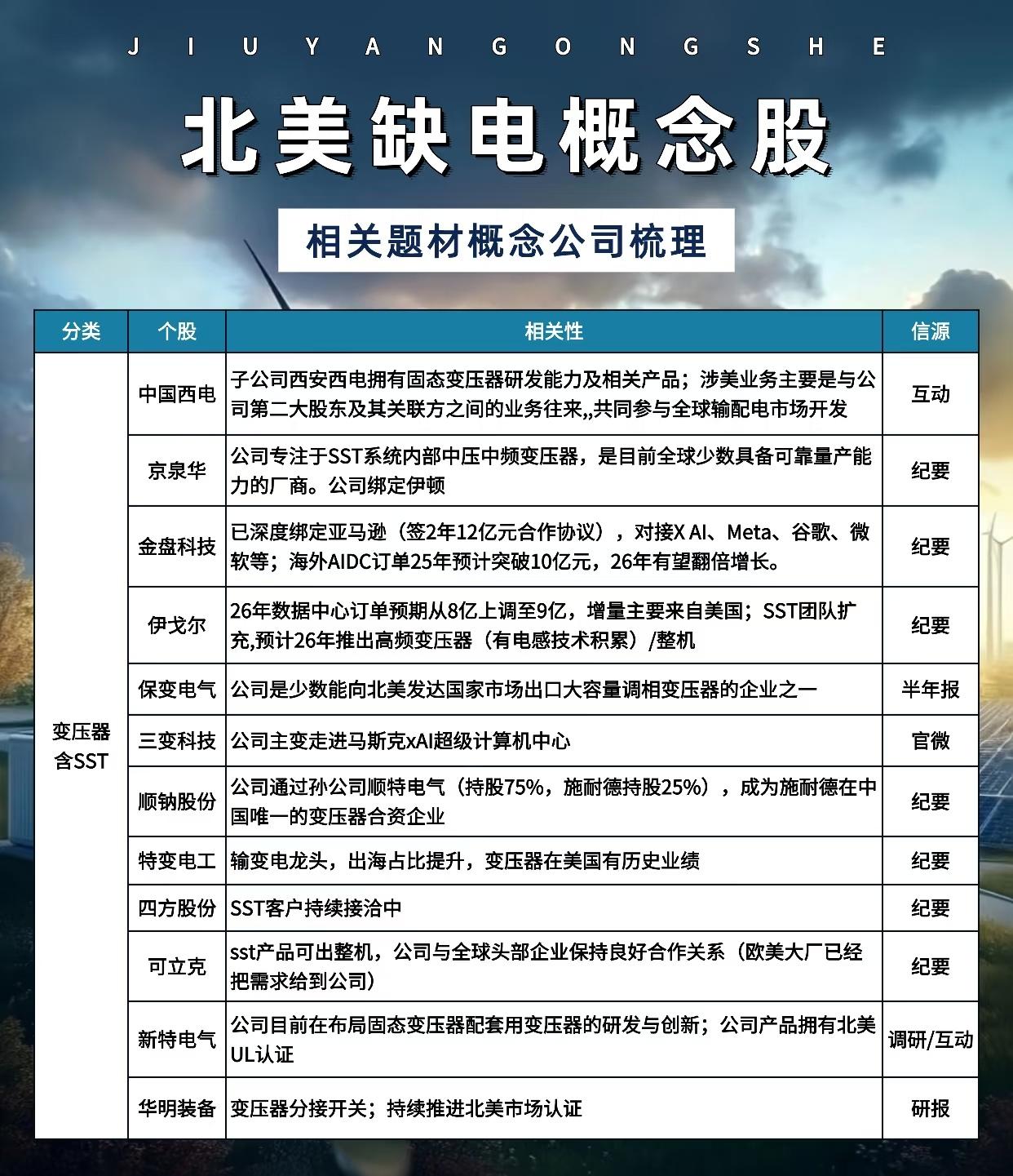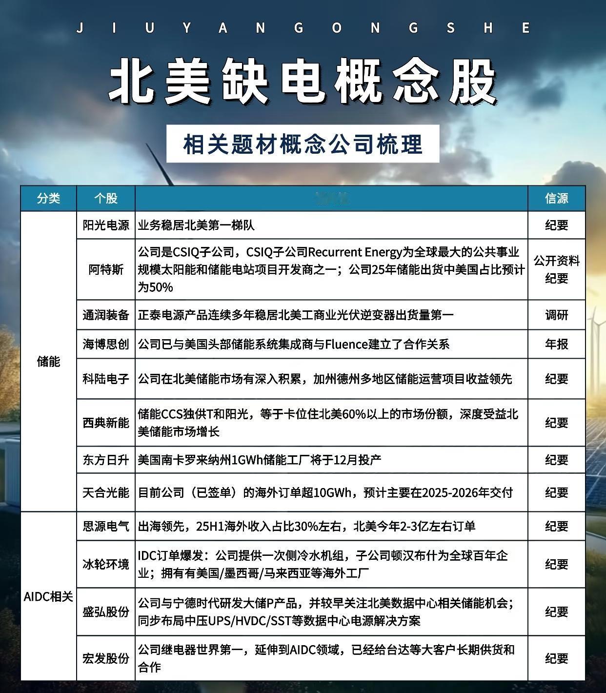 “北美缺电概念股” 一、燃气轮机及热端部件(核心高温部件、燃机配套) 背景说明: 北美部分区域面临电力供应紧张,传统燃气发电仍为重要基荷与调峰手段,燃气轮机及其关键部件(如燃烧室、压气机叶片、涡轮盘、环锻件等)需求旺盛。 相关公司及业务亮点: - 飞沃科技:为GE Vernova供应燃气轮机燃烧室钣金件及精密机加件。【信源:官微】 - 航亚科技:向美国GE供应压气机叶片、压气机盘、涡轮盘。【信源:调研】 - 应流股份:国内燃机叶片龙头,与GE、贝克休斯、西门子、卡特彼勒等深度合作。【信源:纪要】 - 万泽股份:“两机”(航空发动机与燃气轮机)热端零部件核心供应商,配套西门子等。【信源:纪要】 - 航宇科技:两机环锻件核心供应商,配套GE Vernova、贝克休斯、西门子等。【信源:纪要】 - 博盈特焊:2025年9月越南工厂投产,有望承接北美余热回收系统(HRSG)需求。【信源:研报】 - 福鞍股份:计划打造燃气轮机制造基地,为GE、福伊特合格供应商。【信源:公告】 - 豪迈科技:产品包括燃气轮机部件,客户有GE、三菱、西门子。【信源:调研】 - 联德股份:绑定卡特彼勒中小型燃机铸件需求。【信源:纪要】 - 隆达股份:燃机材料出口占比1/3,为出海龙头。【信源:纪要】 - 精工科技:与清航空天合作开发燃气轮机热端部件,切入全球燃机供应链。【信源:纪要】 - 三角防务:与西门子能源签署燃机项目开发及框架订单协议。【信源:公告】 - 常宝股份:特色产品HRSG(燃气轮机余热锅炉),是GE优秀供应商。【信源:调研/年报】 二、储能(北美储能市场需求高增,尤其工商业与电网级储能) 背景说明: 北美(尤其是美国)储能市场增长迅速,尤其是在工商业储能、电网调峰、新能源配套等领域,中国企业凭借技术与成本优势占据重要份额。 相关公司及业务亮点: - 阳光电源:储能业务稳居北美第一梯队。【信源:纪要】 - 阿特斯(CSIQ子公司):旗下Recurrent Energy为全球最大公共事业级太阳能与储能项目开发商之一,2025年储能出货美国占比预计达50%。【信源:公开资料/纪要】 - 通润装备:旗下正泰电源连续多年稳居北美工商业光伏逆变器出货量第一。【信源:调研】 - 海博思创:与美国头部储能系统集成商Fluence建立合作。【信源:年报】 - 科陆电子:在北美(加州、德州等地)有多个储能运营项目,收益领先。【信源:纪要】 - 西典新能:储能CCS(电芯连接系统)独供T公司(推测为特斯拉)和阳光电源,占据北美60%以上市场份额。【信源:纪要】 - 东方日升:美国南卡罗来纳州1GWh储能工厂将于2024年12月投产。【信源:纪要】 - 天合光能:海外储能订单超10GWh,主要在2025-2026年交付。【信源:纪要】 三、AIDC(互联网数据中心)及电力配套(数据中心供电、温控、不间断电源等) 背景说明: 随着AI算力需求爆发,北美数据中心建设提速,对供电系统(如高压直流、不间断电源、变压器)、温控设备等需求激增。 相关公司及业务亮点: - 思源电气:出海领先,2025年上半年海外收入占比约30%,在北美有2~3亿订单。【信源:纪要】 - 冰轮环境:IDC订单爆发,提供一次侧冷水机组,子公司顿汉布什为全球百年品牌,拥有美/墨/马海外工厂。【信源:纪要】 - 盛弘股份:与宁德时代合作研发大储产品,同时布局中压UPS、HVDC、SST等数据中心电源方案。【信源:纪要】 - 宏发股份:全球继电器龙头,产品延伸至AIDC领域,长期供货台达等大客户。【信源:纪要】 - 金盘科技:与亚马逊签订2年12亿元合作协议,服务X AI、Meta、谷歌、微软等,预计2025年海外AIDC订单突破10亿元,2026年翻倍。【信源:纪要】 四、变压器及电力传输设备(输配电升级、SST相关) 背景说明: 北美电网老化,对变压器、固态变压器(SST)、中压中频变压器等输配电设备需求稳定增长,国产厂商逐步进入国际供应链。 相关公司及业务亮点: - 中国西电:子公司拥有固态变压器研发能力,涉美业务主要通过股东关联方参与全球输配电市场。【信源:互动/纪要】 - 京泉华:全球少数具备SST中压中频变压器量产能力的厂商,绑定伊顿。【信源:纪要】 - 金盘科技:同上,深度绑定海外AI与云服务商。【信源:纪要】 - 伊戈尔:2026年数据中心订单预期上调至9亿元,增量主要来自美国,SST团队扩充并计划推出高频变压器。【信源:纪要】 - 保变电气:少数能向北美发达国家出口大容量调相变压器的企业之一。【信源:半年报】 - 三变科技:主变压器进入马斯克xAI超级计算机中心。【信源:官微】 - 顺钠股份:通过孙公司顺特电气(施耐德持股25%)
