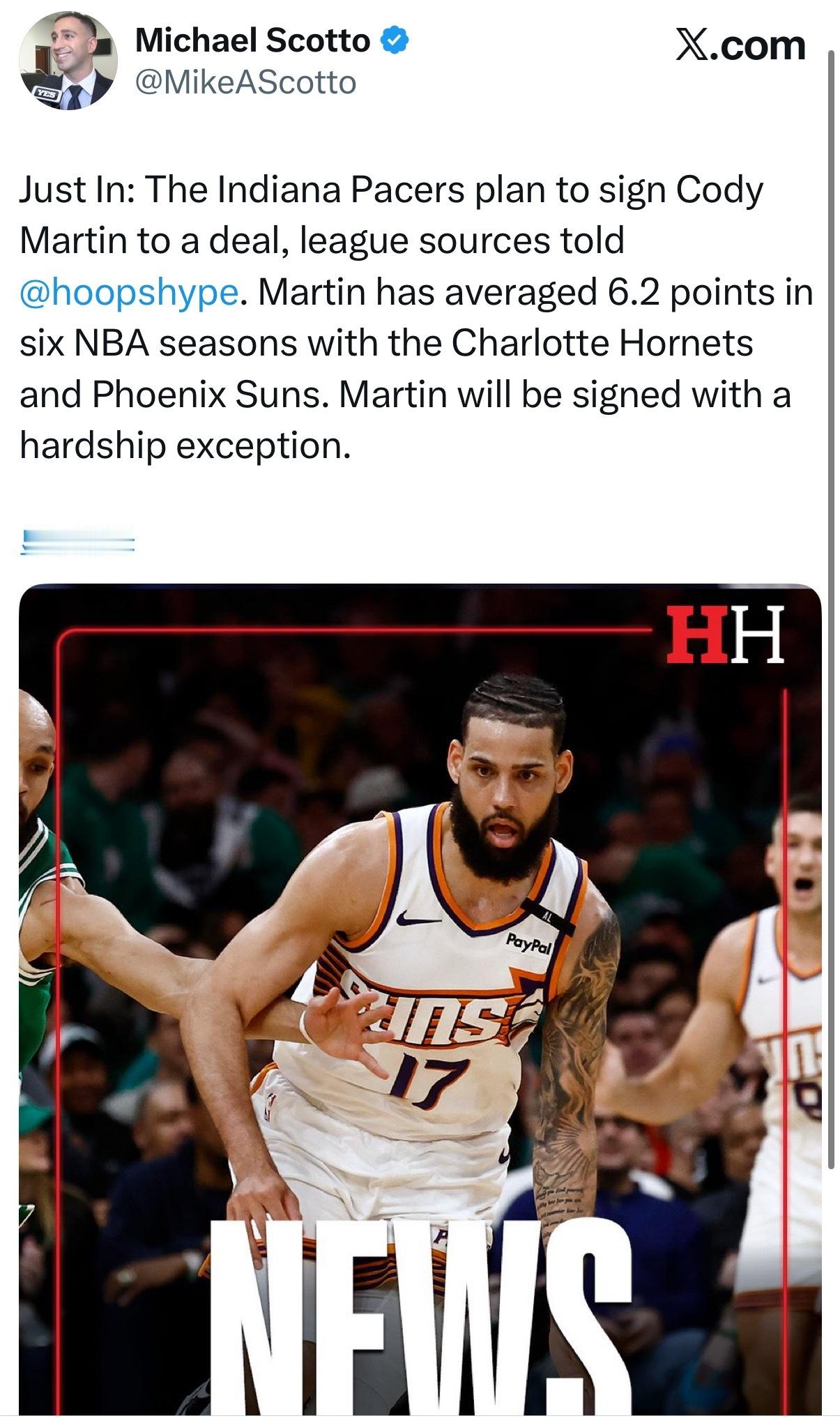 scotto:步行者计划与科迪·马丁签约。马丁在 NBA 效力 6 个赛季,场均得到 6.2 分,曾效力于黄蜂和太阳。步行者将使用伤病特例签下他。