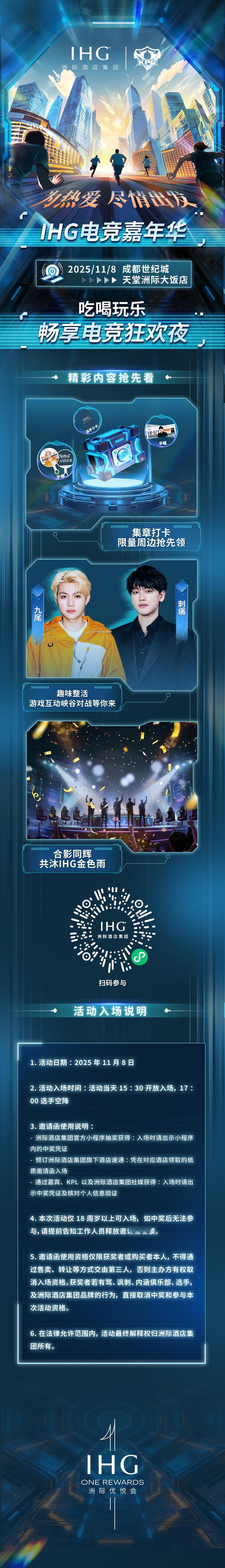 11月8号,万众期待的IHG电竞嘉年华不仅有超人气选手亲临现场,现场还准备了紧张刺激的水友赛,能和偶像并肩作战,还有趣味满满的游戏互动环节,参与就能解锁专属的嘉宾限定周边!想参加IHG电竞嘉年华很简单,现在去点进就能抢邀请函,就算抽奖没中也不用慌,购买活动页面指定套餐就能直接拿到IHG电竞嘉年华邀请函!赶紧加入洲际优悦会为热爱尽情出发洲际酒店集团KPLIHG电竞嘉年华