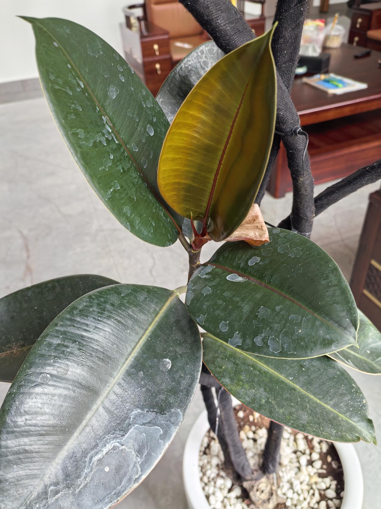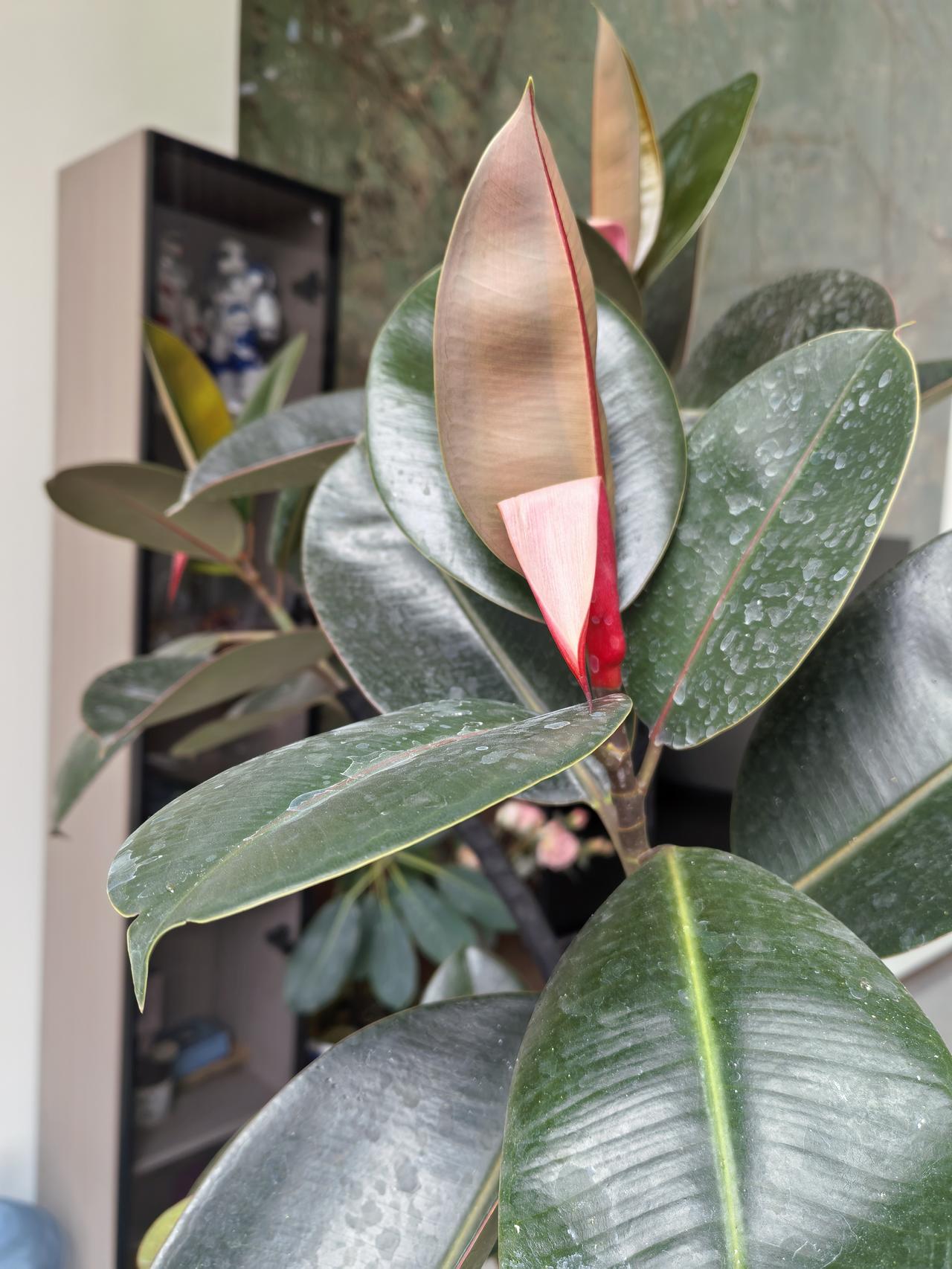 在客厅摆放一盆橡皮树,不仅美观雅致,能将客厅装点得更加赏心悦目,而且橡皮树寓意着吉祥如意、招财旺运。我家客厅就养了一盆,近半年来,在我的悉心照料下,每隔半月或二十来天,它的每个枝条都会抽出一片新叶。叶片肥厚且翠绿,瞧,它新发的叶片正褪去包衣呢!