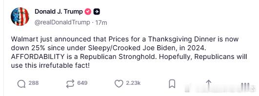 沃尔玛刚刚宣布,自2024年“瞌睡乔/骗子乔”拜登执政以来,感恩节晚餐的价格已经下降了25%。价格实惠一直是共和党的堡垒。希望共和党人能利用这个无可辩驳的事实!