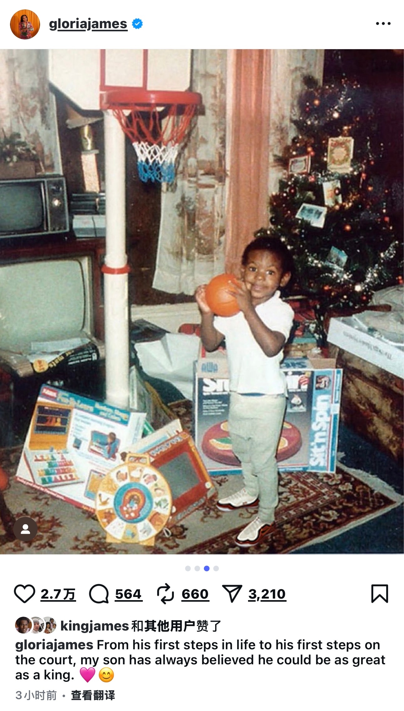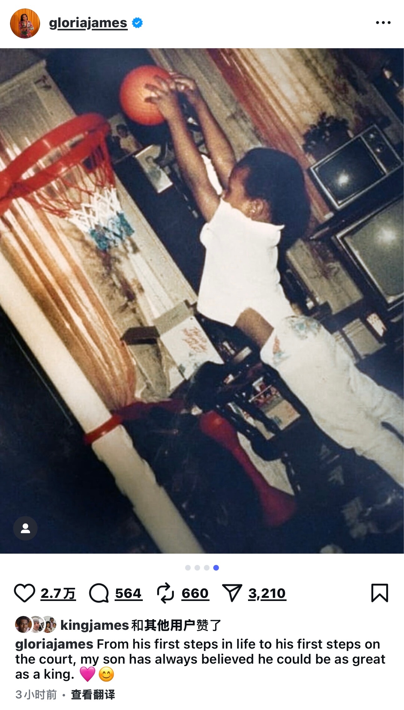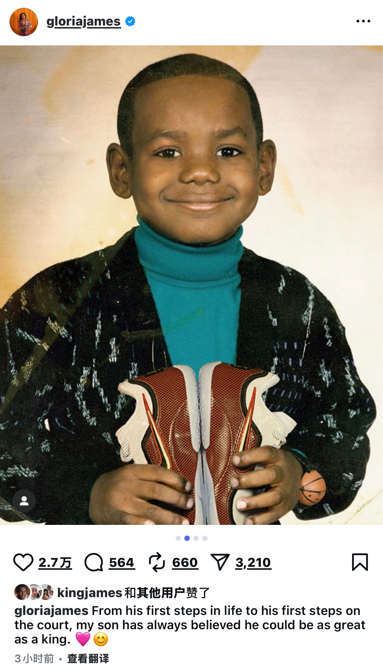 “从他人生的第一步,到球场上的第一步,我的儿子一直相信自己能像国王一样伟大。💜😊”