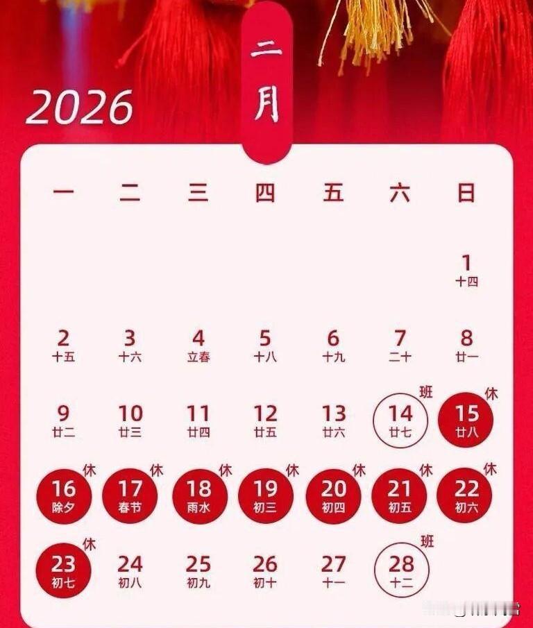 2026年春节放假安排一出,朋友圈炸了锅。2月15日到23日连休9天!这长假看着让人激动。可表面风光,实则前借周末、后补调休,2月14日、28日上班,真正白送的假期太少。 前几年,7天长假已是标配,但代价永远是节前连上7天班累成狗。2026年不过是节后无缝衔接周末,再搭上两天调休,拼出个“超长待机”,假! 要说,最郁闷的还是这三类人: 一是年轻爸妈,9天听起来够带孩子返乡+旅行?可幼儿园放假晚、开学早,实际能用的可能就5天。 二是私企员工,老板一句“项目赶工”,调休变值班,加班费?做梦吧。 三是异地游子,看似省了年假,可除夕前高铁抢票太难,路上还得耗掉2天。 难怪有人说,调休像赊账,迟早要还的。要我说啊,都省省吧,别人心不足了。有 条件的,提前请2天错峰出行,避开高速堵车。不行的,就近逛逛庙会、下下馆子,团圆在哪不行呢。如被克扣了调休,千万别跟老板讲《劳动法》,切记切记! 不过要是把2 月 14 日上班,改到 2 月 8 日或 7 日就好了,懂的都懂哈。大家说是不是啊?