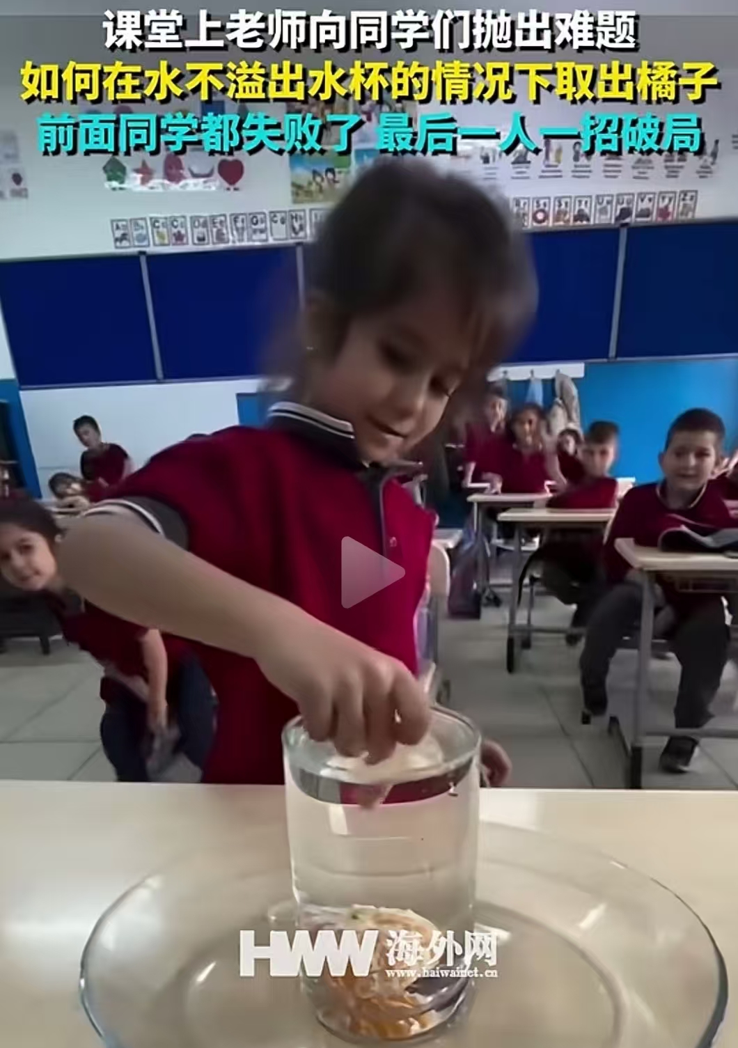 外国老师在课堂上向同学们抛出难题,如何在水不溢出水杯的情况下取出橘子,前面同学都失败了,最后一人一招破局!网友:这个方法,我一个大人也想不到,真的太聪明了!