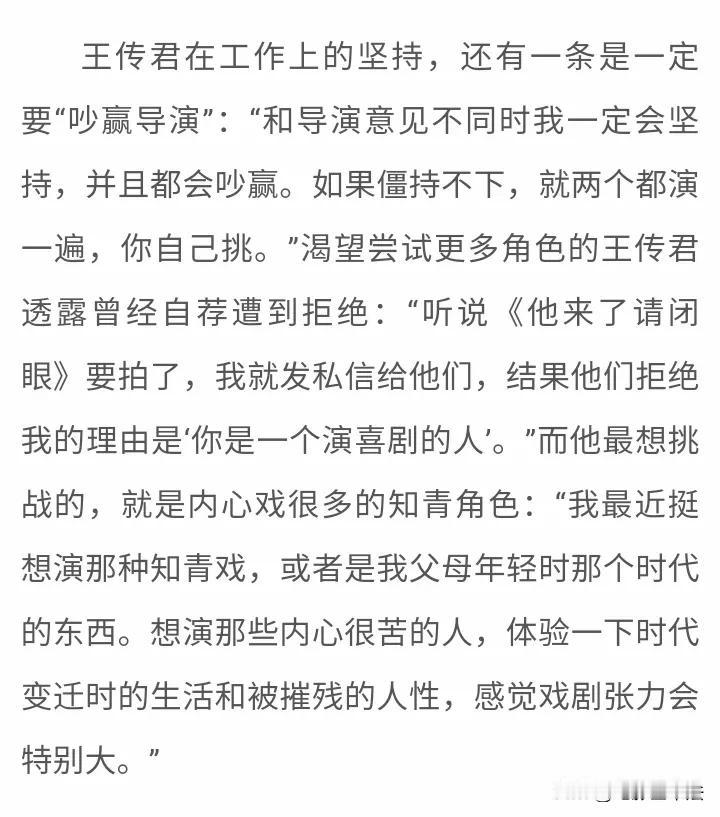 王传君曾经向《他来了请闭眼》剧组毛遂自荐出演男主薄靳言,就是霍建华那个角色,但是导演以他是喜剧演员为由拒绝了她。 王传君是个对事业非常有追求的人,虽然演喜剧出名,但他最想演的其实是年代戏,比如演一个知青,演他父母年轻时那个年代的戏。 因为他觉得那个年代的人很苦,因为时代的变迁人性被摧残,他认为那样的角色,戏剧张力会特别大。