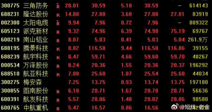 军工板块盘初走强,三角防务20cm涨停,航宇科技、航亚科技涨超7%,中航重机、航发动力、爱乐达、迈信林等跟涨。金店关门潮蔓延金银暴涨意味着全球滞胀吗