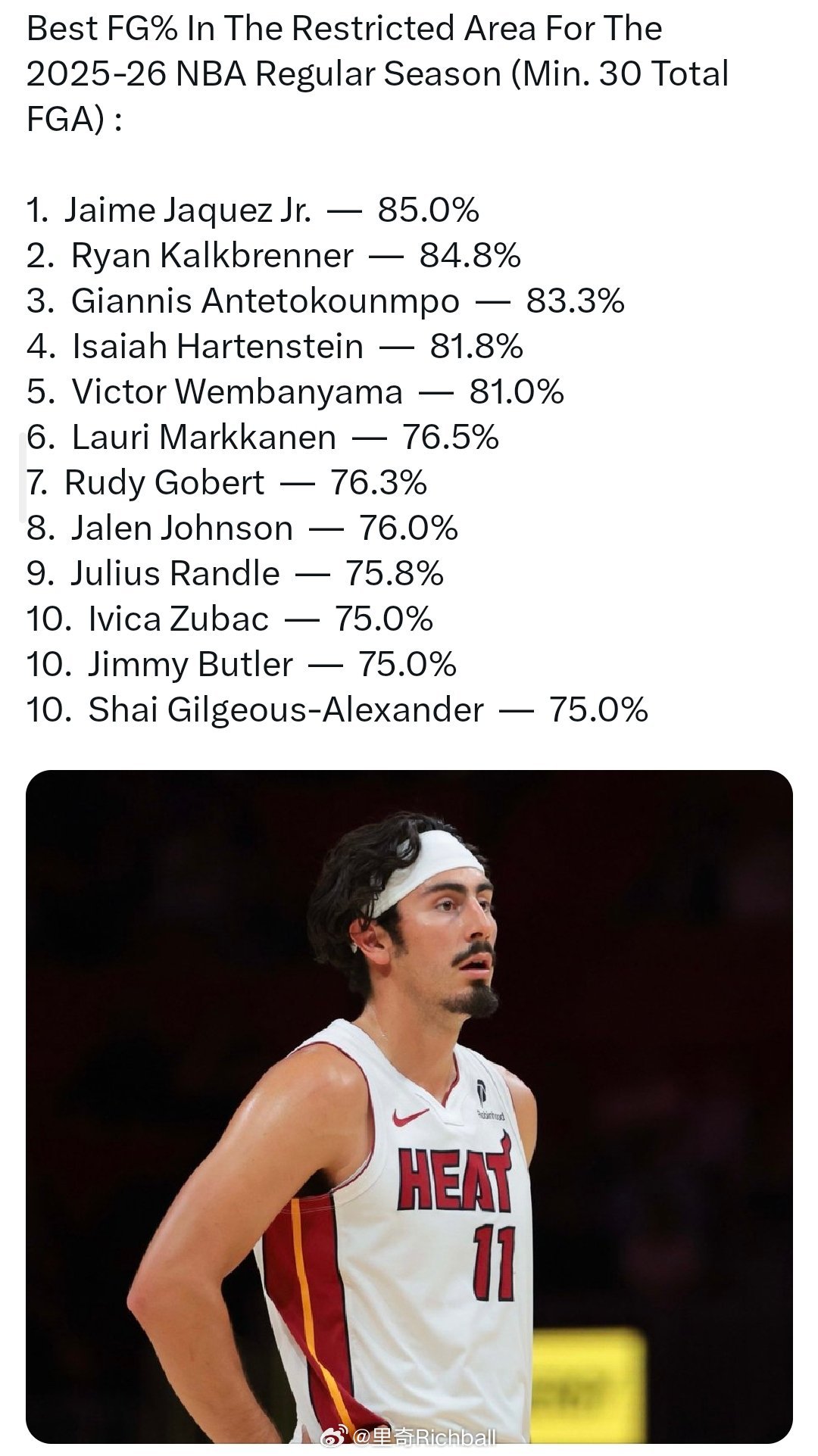 哈克斯目前为止,禁区内的命中率排名联盟第一[666]