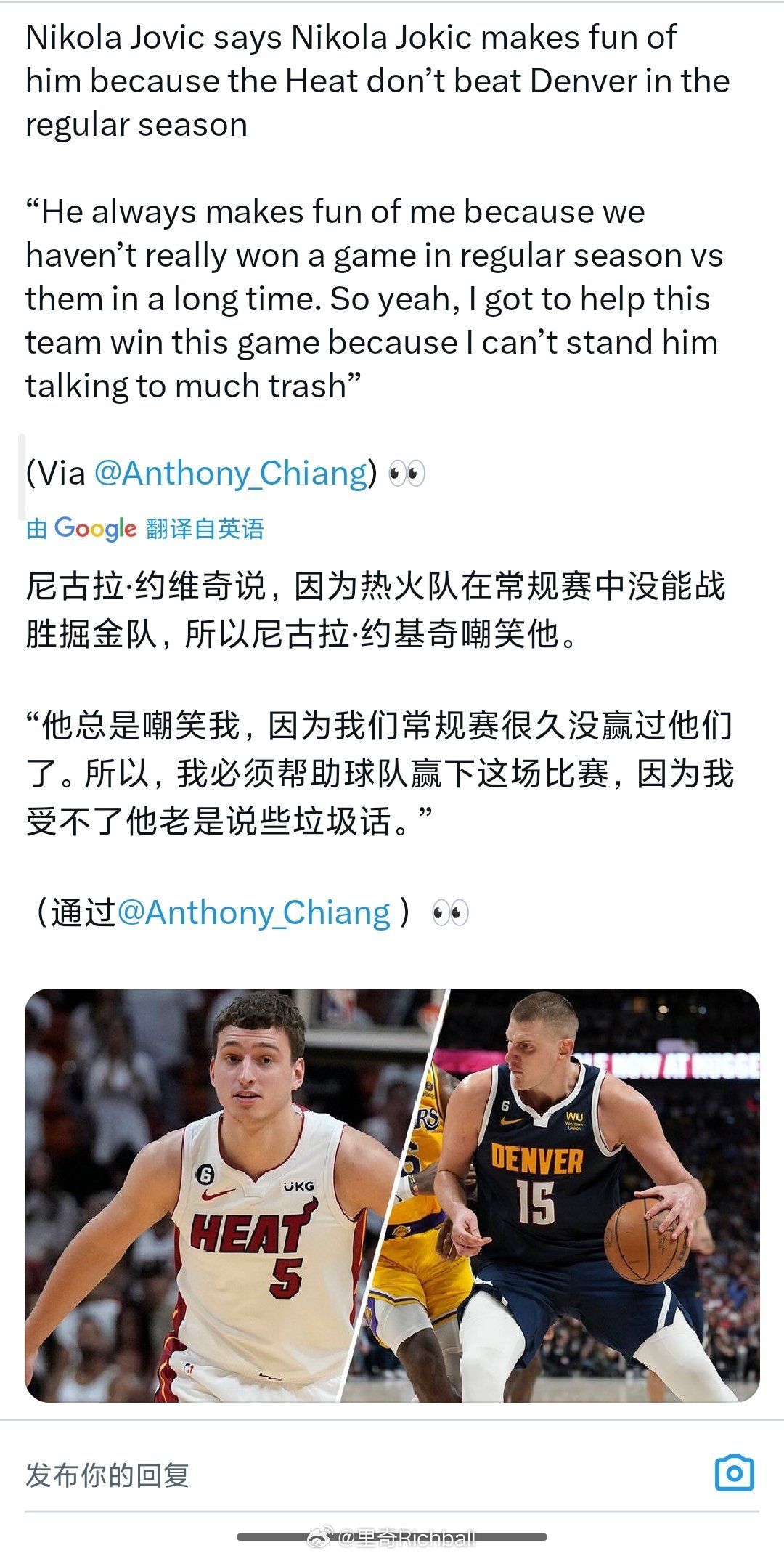 约基奇经常嘲笑约维奇[流鼻血]热火vs掘金