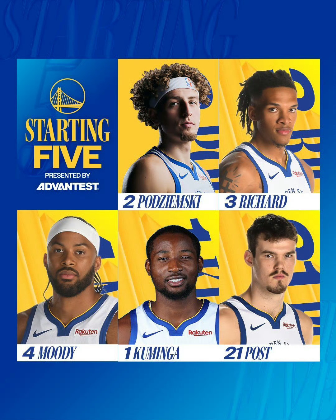 勇士今日首发:波杰、理查德、穆迪、库明加和波斯特。