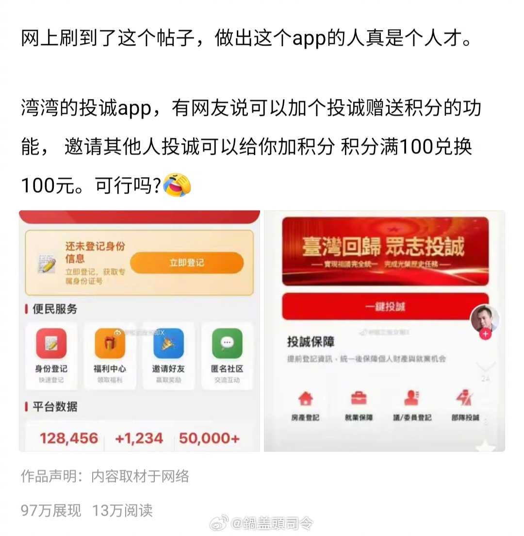 这个#台湾 投诚APP#我之前就注意到了[允悲][允悲],当时在隔壁平台发了一下,近100万曝光[笑cry][笑cry],讨论十分热烈。