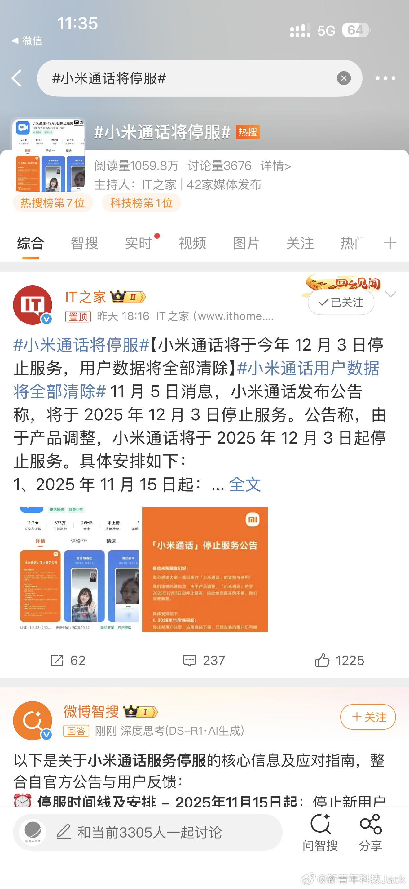 小米通话将停服 ???小米啥时候还有这个软件来着?说实话我都没用过这东西,这就和微信相当于是一个第三方通信软件,小米通话停服和手机本身打电话没关系,而且网络通话现在不都用微信么?谁用其他软件啊,停了也正常其实,这都能热搜么? ​​​