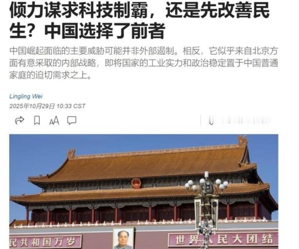 美媒声称中国的做法,完全错误了!华尔街日报刊文声称,中国现在的做法,这是选择继续以科技与制造业为核心驱动力,而不是优先改善民生和刺激内需。北京在26年至30年的发展蓝图中,号召全国动员,采取“超常规措施”在半导体等关键技术上实现决定性突破,以加快科技自立自强进程。 但真正了解中国近几十年变化的人,谁都清楚,中国吃的就是产业一步一步往上爬的苦头。从上世纪八九十年代小工厂生产鞋袜,到家用电器大规模出口,再到现在高铁、汽车、芯片成世界工厂,这个发展节奏没断过。 1990年代工厂工人一个月只有几百元收入,如今在深圳工厂里,熟练工一月能拿到一万五,买房买车都敢下手。制造业往上走,工资自然往上翻。 高科技公司扩招拉动更多就业,年轻人在新赛道能拿到让父母都羡慕的收入。国家不可能把每块钱都铺到民生福利上,得找个地方发力,赚钱的产业搞起来了,生活怎么会没改善? 眼下全国各级都动起来,不管是半导体、工业装备还是生物医药,都要在2026-2030年让自家技术有决定性的突破。搞这些,还真不是喊口号。 政策上给真金白银的补助,给企业减税,实验室科学家连夜干活,目标就是解决“国外卡脖子”,让核心产业不再受人限制。 华为已经最有说服力,国外制裁、芯片断供下,海思芯片还是挺了过来,国产系统也慢慢热了起来。 华为光税收一年就数千亿,还带着上下游公司一起挣钱。普通人用得起便宜又好用的手机,公司继续雇更多人干活。 技术突破的好处不光反映在工厂和企业,眼下国内电子元器件、汽车电池一步步站上世界前列,高端医疗设备国产化快,超市货架上国外水果随手买,家里的电器都更智能。 有了新产业,年轻人就业机会多了,收入不断涨,消费市场自然也就热了。社会保障范围一年比一年广,人们越发有底气掏钱花,电动车、国产高端手机早成了流行选择。 反过来看美国自己,年年军费惊人,为什么这笔钱不是拿大头拨去福利呢?美国一边自己发展高科技,一边给别的国家出主意,本质上就是不愿意别人威胁到他们的蛋糕。 对中国来说,把有限的钱投入到产业升级,把科技底盘做厚,是让全国老百姓过更好日子的关键一步。 数据已经证明了这条路没人走过冤枉路。过去几十年,从贫困到小康,普通家庭感受到收入变多,未来想着过得更体面。这些变化不是靠喊口号,而是靠每一项产业升级撑起来的。 其实,科技和民生根本不是对立的东西。没有产业撑腰,谈民生只能空聊梦想。中国的路是靠一步一个脚印,把最难啃的硬骨头啃下来,让普通人最终享受到成果。