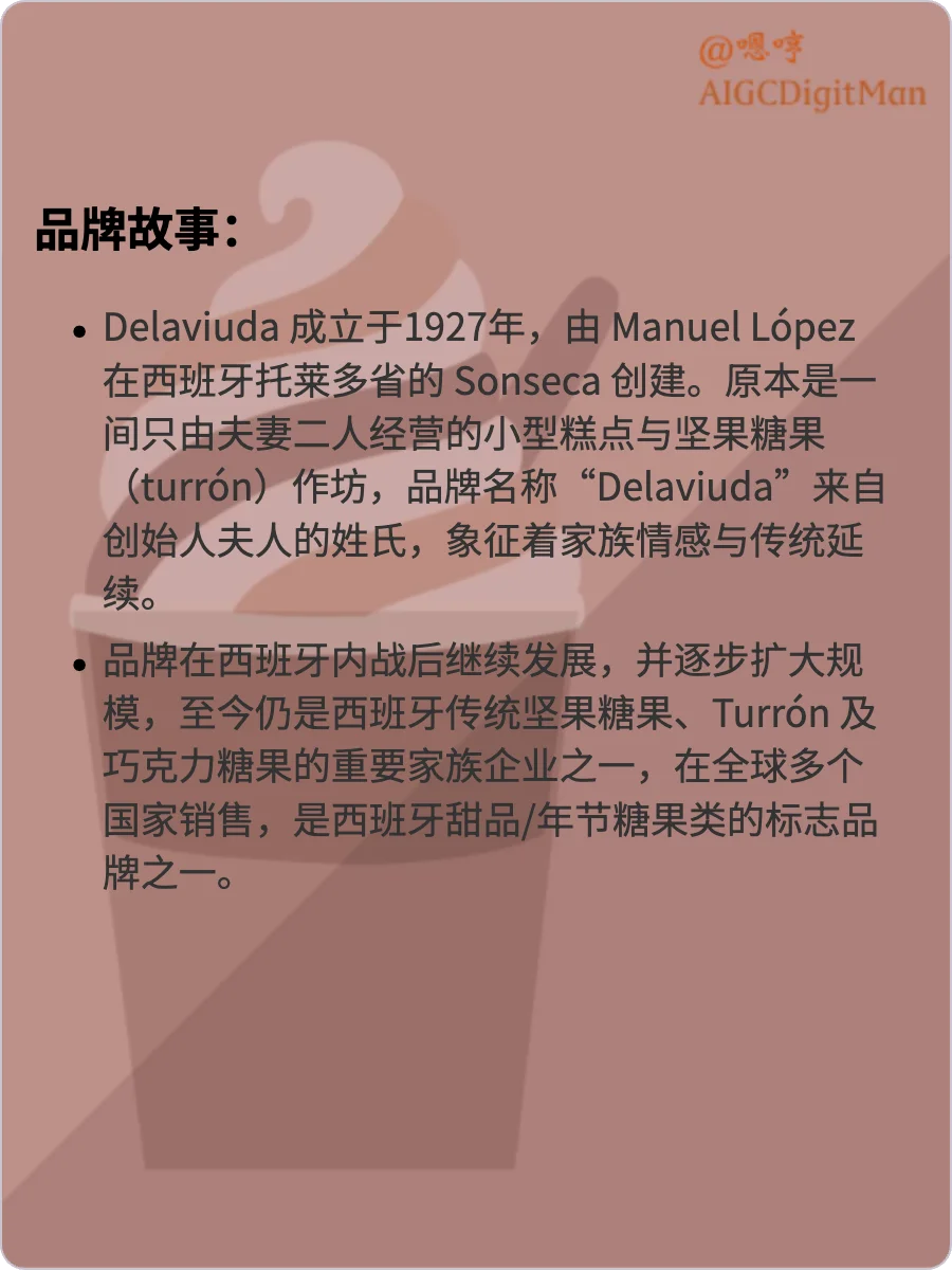 原本是一间只由夫妻二人经营的小型糕点与坚果糖果(turrón)作坊,品牌名称“Delaviuda”来自创始人夫人的姓氏,象征着家族情感与传统延续。
