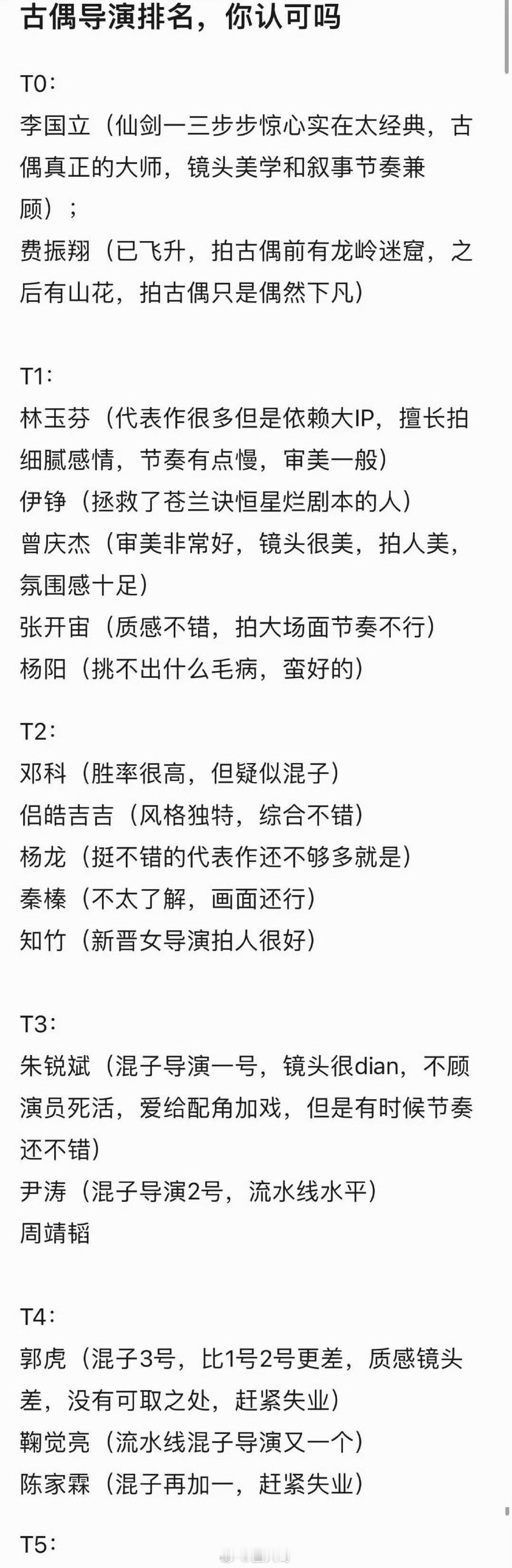 没想到现在连内娱的古偶剧导演,都有排名了啊,看得出来古偶剧在观众心中的 份 量 啦~李国立、费振翔、林玉芬、张开宙、曾庆杰,邓科、朱锐斌、尹涛等,《仙剑一》《仙剑三》《苍兰诀》这种剧已经在内娱封神了吧~