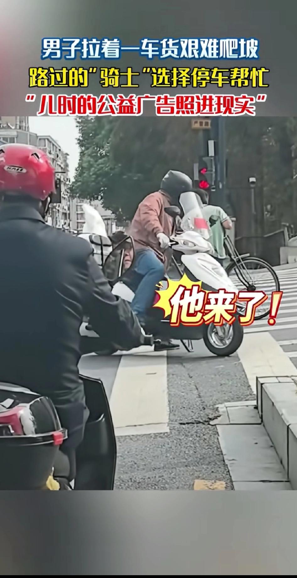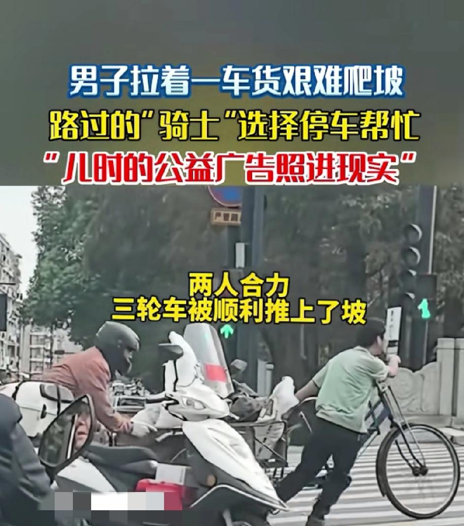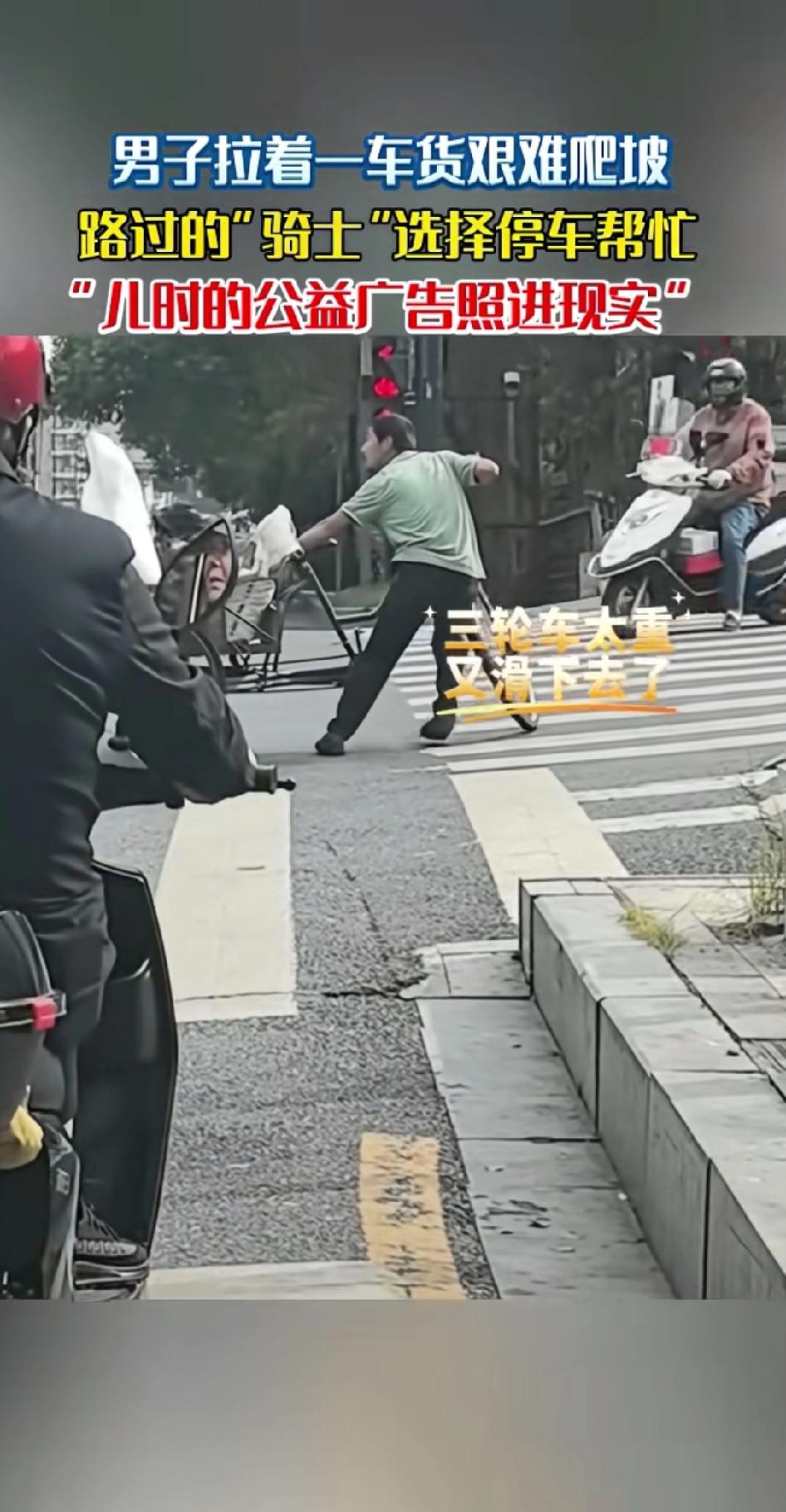 这个世界还是好人多呀 一个男子拉着一辆三轮自行车 车上装满了东西 上坡路段艰难前行 一个骑电动车的男子看到了 专门绕到他跟前 下车去帮他推车 俩人合力把车子推了上去 普通的小事总能温暖人心[赞][赞][赞]