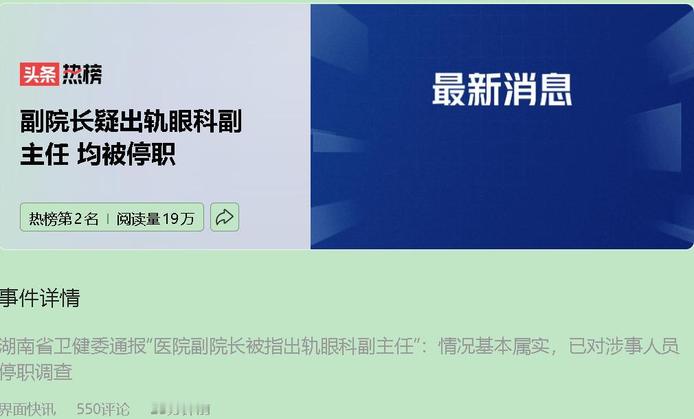 值班室内惨白的墙,消毒水的气味刺鼻,折叠床上的蓝格子床单洗得发灰。凌晨三点,走廊尽头的脚步声格外清晰。可谁能想到,就是这间承载无数生死焦虑的房间,最近成了全网吃瓜的现场。 事情爆出来那天,微信群炸了。17分钟的视频,比任何医疗剧都狗血。副院长和眼科主任,两位平时患者挂不上号的专家,竟在这里私会。网友戏称“值班室当婚房”,可笑着笑着,心里泛起苦涩——我二姨为了挂那位眼科专家的号,曾在凌晨三点的医院门口排长队。 有人说是私事不该管。但当你听说,那位眼科医生刚破格晋升正高,而副院长恰是评审组副组长;当你计算着正高职称每年多拿四万,退休后每月多领三千——这还只是私事吗? 更讽刺的是,视频疑似女方丈夫安装隐藏摄像头获取。愤怒可以理解,但传播视频的每个人,都在不知不觉中踩了法律红线。现在官方通报重点批评“传播违法”,对监管问题却轻描淡写。这不就像只抓卖盗版光盘的,却不管偷东西的人? 我邻居老爷子听说这事后,叹了口气:“从前医生的白大褂一尘不染,现在有些人的心,却不干净了。”他去年做手术,偷偷给主刀医生塞了红包,医生当场退还:“老人家,我们靠技术吃饭。” 医疗反腐去年查了184位院长,可每次出事都是“停职调查”,然后呢?没有然后。热度一过,换个地方继续上班。这种“冷处理”,寒的是老百姓的心。 其实我们都明白,这世界非黑即白。医生也是人,有七情六欲。但如果连最基本的职业操守都守不住,穿着白大褂时都管不住自己,患者怎么敢把命交到他们手上? 信任像张白纸,皱了就再难抚平。每次这样的丑闻,都是在所有医护人员的白衣上,泼了一滴难洗的墨。 如今两位专家已停诊三周,调查结果遥遥无期。我只希望,下次深夜路过那间值班室时,里面亮着的灯,是为了等待真正的患者。副院长疑出轨眼科副主任 均被停职 (本文事实依据:湖南省卫健委通报、媒体报道、律师解读等)