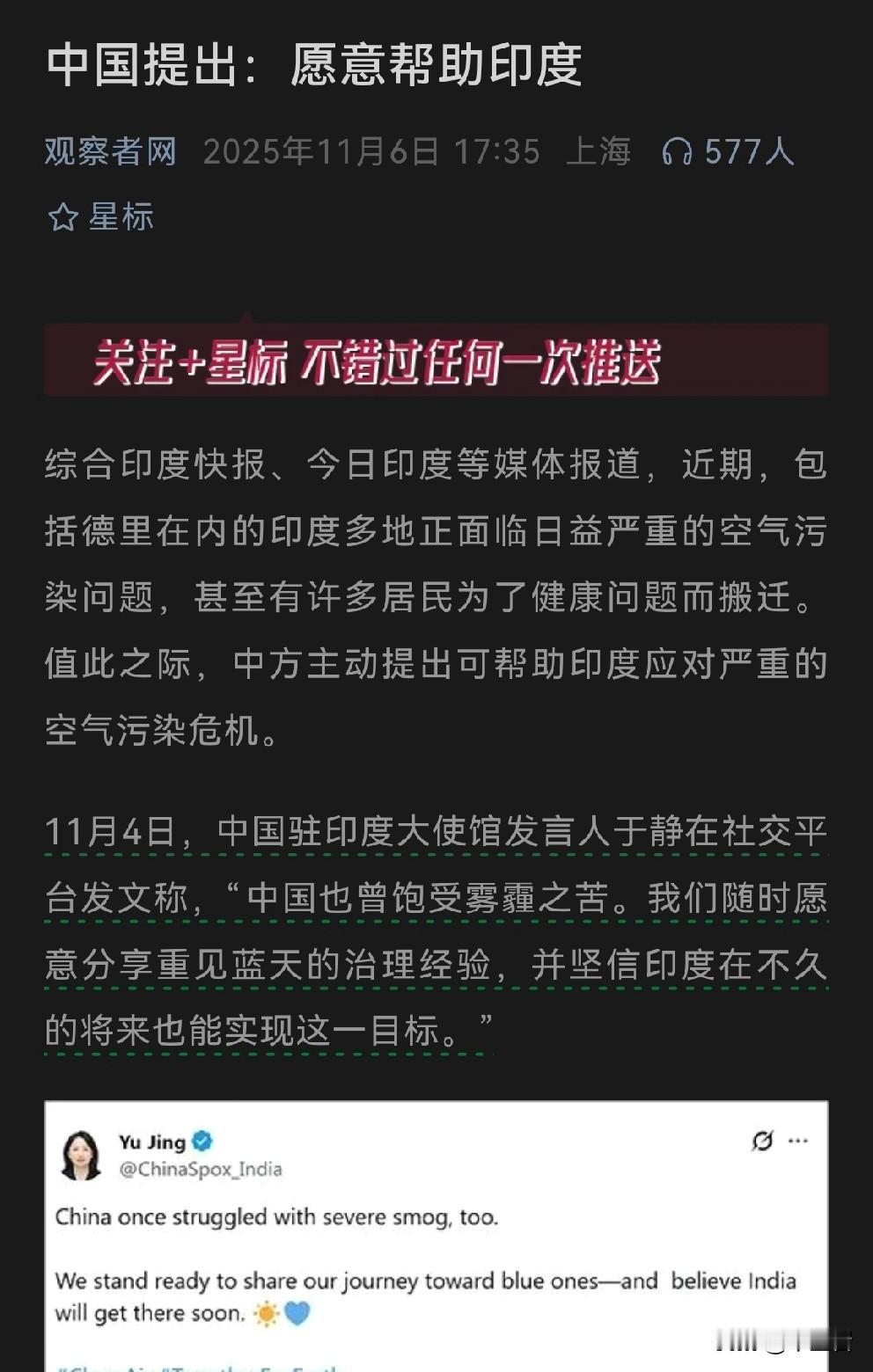 [捂脸]中国又要被印度骂了…… 这个地球上谁都可以帮印度,只有中国帮不得!! 印度的污染就让它去污染吧,这事中国真的帮不上忙,你就是哪怕说句话都会惹得一身骚。 我不怀疑我们的外交官是怀着善意为了促进中印友好说这话的。 可是你仔细看看,这都怎么说的? 什么关闭小燃煤锅炉?什么搬迁高污染企业? 你也不想一想,莫迪老仙一直在念叨什么? 它的印度制造现在还挂在半空中,没影子,现在你跟他谈什么拆迁污染企业?? 这在莫迪老仙以及其一众支持者看来,不是你要拆解他们的宏伟计划的阴谋诡计,还能是什么? 还什么卫星监控污染,在他们理解起来,这不是我们拿着卫星找导弹目标吗? 唉,印度要怎么样就怎么样吧,反正有喜马拉雅山隔着,一时半会也闹不到我们这里来,别惹事了……