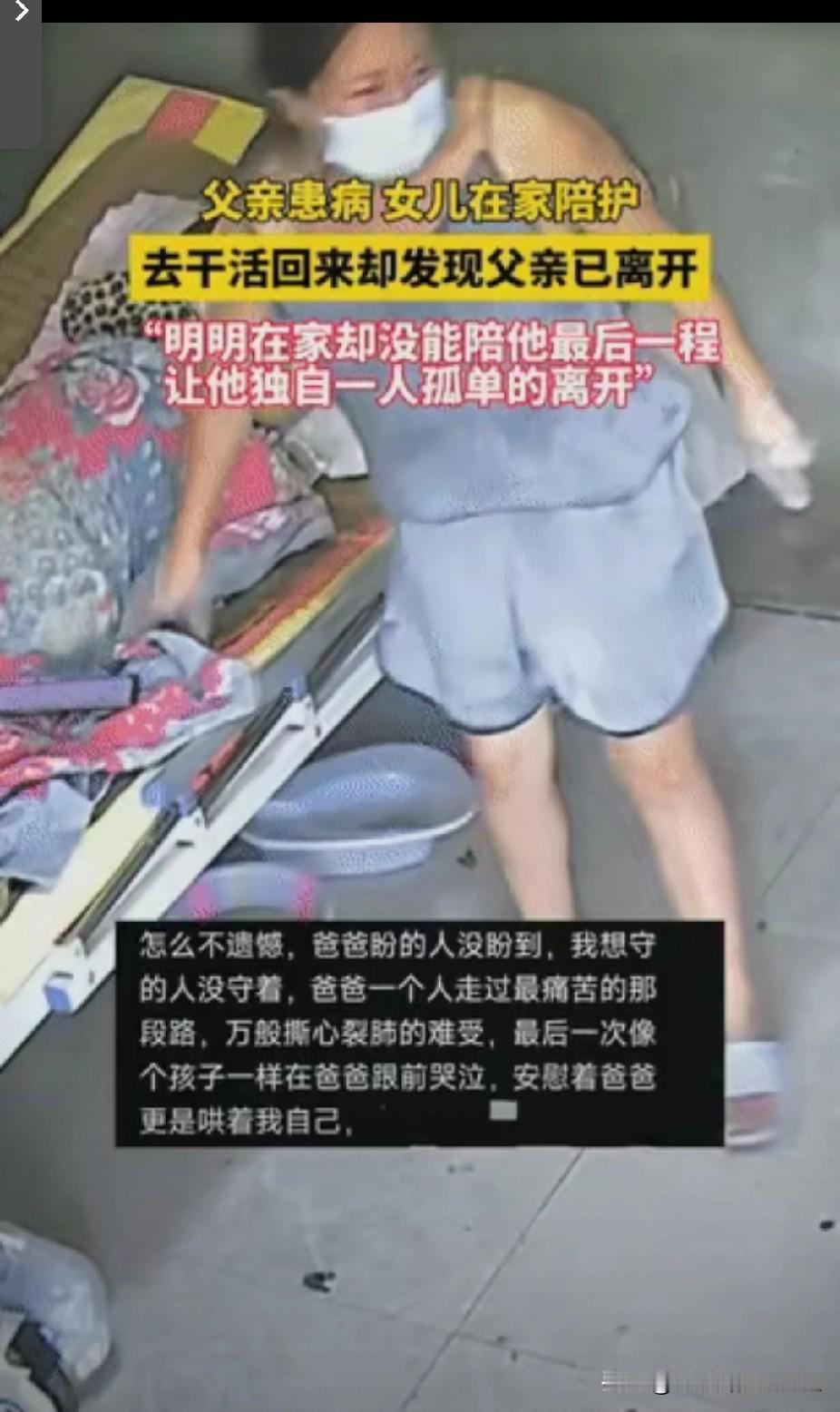 泪目了!父亲患病在家女儿在家照顾,没成想女儿出去干活后回来,发现父亲已经离世。女儿守在父亲床边撕心裂肺的呼喊“爸爸,爸爸”心酸的是明明自己在家却被没能陪父亲走完最后一程!网友:“这种遗憾可能是无法言说的”。 女儿的手还停留在父亲冰凉的额头,刚才出门前她还特意试了试温度,那时父亲的呼吸虽微弱却依然存在。她只是去地里干了两个小时的活,想着赚了钱给父亲买点营养品,谁知这一别竟是永恒。父亲走得安静,仿佛不愿打扰忙碌的女儿,连最后一点声响都没留下。这种遗憾像一根刺,深深扎进心里最软的地方——明明守候了那么久,偏偏在最重要的时刻缺席。 这种痛彻心扉的遗憾背后,藏着无数独生子女共同面临的困境。他们是唯一的孩子,没有兄弟姐妹可以分担照顾父母的责任,所有压力都落在一个人肩上。就像那个在急诊室里眼睁睁看着父亲离去的24岁女孩,她撕心裂肺地哭喊“我就他一个人了”,这句话道尽了独生子女在家人病重时的孤独与无助。当生命中最重要的人即将离去,他们必须独自面对所有医疗决策、签署那些关乎生死的文件,然后在无人的角落里抱着枕头崩溃大哭。 现代社会的流动性加剧了这种困境。孩子们为了生计远离家乡,留下年迈的父母成为空巢老人。即使有孝心,也很难时刻陪伴在父母身边。数据显示中国老龄化程度不断加深,空巢老人比例逐渐上升,这使得“养老”不仅仅是经济负担,更是情感陪伴的难题。就像那位因为担心“人财两空”而拒绝住院的父亲,以及那个跪在地上磕头哀求他接受治疗的女儿,他们彼此深爱,却被现实压得喘不过气。 我们文化中深厚的孝道传统在这种现实压力下遭遇了挑战。“父母在,不远游”的古训在当今社会很难实现,学生异乡求学,农民进城务工,职场人奔波在不同城市之间。即使有《老年人权益保障法》规定子女必须看望父母,但面对生活压力,许多人依然难以常回家看看。真正的孝顺不仅在于物质供养,更在于情感交流与陪伴,让父母心情愉悦才是至孝。 面对父母老去的过程,每个人都可能经历这种无法言说的遗憾。生命的逝去从不会提前预告,它总在不经意间降临。或许我们需要重新思考何为真正的孝顺——不是苛求每时每刻的陪伴,而是珍惜每一个相处的瞬间;不是追求完美的送别,而是减少过程中的遗憾。在父亲还能感知的时候,女儿已经给予了无微不至的照顾,这本身就是孝心的最好体现。 各位读者你们怎么看?欢迎在评论区讨论。