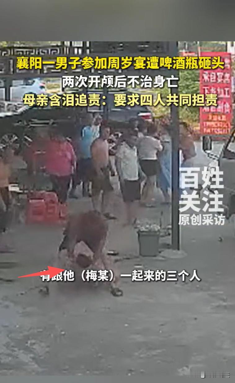湖北襄阳,一26岁男子参加朋友孩子满岁酒,正举杯祝福朋友的孩子。不料,男子因琐事与同在宴席上的小伙发生争执。推搡间,小伙情绪失控抄起桌上的啤酒瓶,狠狠砸向男子头部,当场倒地昏迷。送医后,男子经历了两次开颅手术,最终因重度颅脑损伤离世。事后,小伙被警方抓获,但男子的母亲认为小伙的堂哥等三人也涉嫌刑事犯罪,依法应当追究刑事责任。   2025年8月24日,某小区内,一场朋友孩子的周岁宴正在热闹举行,宴会上,宾客们举杯庆祝,孩子们嬉笑打闹,一片祥和。   然而,谁也没想到,这个看似普通的聚会,竟会以一场无法挽回的悲剧收场。   26岁的冯某是宴会主人的好友,性格开朗,平时人缘不错,他早早来到现场,帮忙布置场地、招呼客人。   梅某则是通过朋友介绍参加的,两人之前并不熟悉,只是偶尔在社交场合见过面。   宴会进行到中途,冯某和梅某在酒桌旁因琐事发生了争执,可能涉及一些玩笑话的误解,双方情绪逐渐激动。   口角一开始只是言语冲突,但后来,你一言我一语,话赶话,言语冲突升级为肢体冲突。   梅某与冯某有互相飞踢等行为,梅某有些不敌冯某,似乎被激怒了,开始疯狂反扑,尽管周围宾客再劝阻,但无济于事。   突然,梅某抓起桌上的一个空啤酒瓶,猛地朝冯某头部砸去,这一击来得太快,冯某来不及躲闪,啤酒瓶重重击中他的头部。   顿时,冯某倒地,头部血流不止,现场一片混乱。   宾客们惊呼着围上来,有人赶紧拨打120急救电话,有人试图止血,但冯某已意识模糊。   救护车很快赶到,将冯某送往当地医院,医生检查后表示,伤势严重,需要立即进行开颅手术。   接下来,冯某经历了两次手术,然而,由于损伤过重,冯某一直处于昏迷状态。   在接下来的近两个月里,他辗转于重症监护室,依靠呼吸机维持生命,他的家人,尤其是母亲李女士,日夜守候在病床前,祈祷奇迹出现。   10月21日,冯某因伤势过重,经抢救无效死亡。   事后,梅某被警方抓捕归案。   冯某去世后,他的母亲李女士强忍悲痛,开始寻求法律帮助,她告诉记者,除了直接动手的梅某外,她还希望追究梅某堂哥等三名涉事人员的刑事责任。   目前,李女士已经将自己诉求向相关部门反映,案件正在进一步侦办中。   1、梅某使用啤酒瓶砸中冯某头部致其死亡,是构成故意伤害罪还是故意杀人罪?   《刑法》第234条规定:故意伤害他人身体的,处三年以下有期徒刑、拘役或者管制。……致人死亡或者以特别残忍手段致人重伤造成严重残疾的,处十年以上有期徒刑、无期徒刑或者死刑。   从案件事实看,梅某在与冯某发生口角后,使用啤酒瓶击打其头部,头部是人体要害部位,用啤酒瓶击打可能造成严重伤害,这是一般人能够预见的,因此梅某至少具有伤害的间接故意。   期间,梅某实施了伤害冯某的行为,冯某被击中头部后,经两次开颅手术无效死亡,伤害行为与死亡结果之间存在直接的因果关系。   需要特别说明的是,梅某的行为应认定为故意伤害致人死亡,而非故意杀人。   故意伤害致人死亡的行为人具有伤害故意,但对死亡结果持过失心态,而故意杀人的行为人则具有剥夺他人生命的故意。   从本案情节看,双方仅因口角引发冲突,梅某使用啤酒瓶击打的行为虽然恶劣,但缺乏证据证明其具有杀人故意,从有利于被告人角度,梅某的行为可能被认定为是激情下的伤害行为。   因此,梅某的行为涉嫌构成故意伤害罪,出现死亡结果,可能面临十年以上有期徒刑、无期徒刑或死刑的刑罚。   不过,从视频来看,不排除冯某与梅某存在互殴的情况,如可以证明冯某有过错,则可能减轻梅某刑事责任。   2、梅某堂哥等三人是否应承担刑事责任?   《刑法》第25条规定:共同犯罪是指二人以上共同故意犯罪。   就本案而言,若要追究梅某堂哥等三人的刑事责任,需要证明以下事实之一:   其一,三人与梅某有共同伤害冯某的故意,并实施了帮助、教唆或共同伤害行为;   其三,三人在现场起到了煽动、助势作用,使梅某的伤害行为得以实施或升级;   其四,三人负有制止义务且能够制止而不制止。   如果证据只能证明三人仅是旁观者,或者仅参与了口角但未实施具体伤害行为,则难以追究其刑事责任。   对于此类突发性冲突,除非有充分证据证明多人共谋实施伤害或者实际参与了殴打冯某,否则一般只追究直接实施者的刑事责任。   也就是说,本案追究梅某堂哥等三人的刑事责任的可能性不大。   3、除刑事责任外,李女士作为家属,有权利主张民事赔偿。   《民法典》第一千一百七十九条规定,侵害他人造成人身损害的,应当赔偿医疗费、护理费、交通费、丧葬费及死亡赔偿金等。   冯某家属可提起刑事附带民事诉讼,要求梅某承担上述赔偿责任,若梅某堂哥等三人被证明参与共同伤害,则需承担连带赔偿责任。   对此,您怎么看?