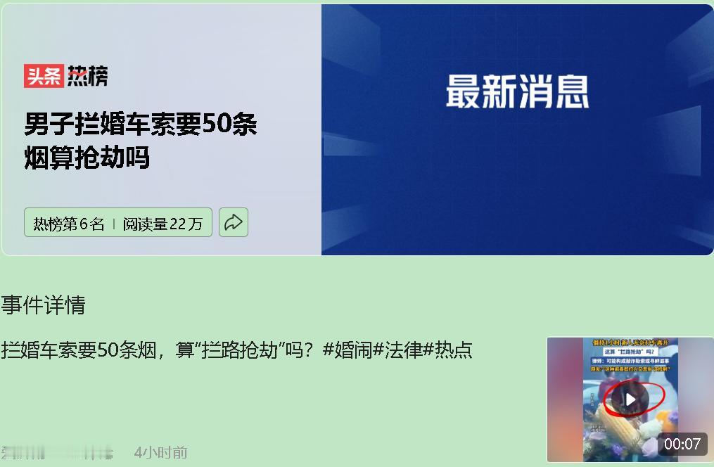 大喜日子,婚车被拦。五十条烟,少一条都不让过。 那天我朋友结婚,头车扎满鲜花,喜庆音乐响得整条街都听得见。忽然前面冒出几个中年人,笑嘻嘻地堵在路中间,开口就是“图个喜庆,给五十条烟就放行”。 新郎摇下车窗,好声好气递红包。对方看都不看:“我们要的是烟,五十条,少一包都不行。” 后视镜里,我看见新娘眼眶红了——不是感动,是委屈。她精心挑选的婚纱,计划了好几个月的路线,全被堵在这了。喜庆的鞭炮声还在响,可车里安静得能听见每个人的呼吸。 “报警吧?”有人小声说。 “算了,”新郎叹气,“吉时快到了。” 最后他们真的下了车,拖着婚纱礼服,在路边拦了辆出租车。新娘回头看了一眼精心装饰的婚车,眼泪终于掉下来。后来她说,那天最大的遗憾不是那五十条烟,是连自己的婚车都没坐成。 这哪是讨喜?分明是拦路打劫。但警察朋友告诉我,这和抢劫还真不是一回事。 抢劫是明抢,这是软刀子割肉——利用的就是你“大喜日子不想闹大”的心理。法律上,这叫敲诈勒索。五十条烟价值上万,够立案了,最高能判十年。就算烟没要到,堵着路不让走,也犯了寻衅滋事罪。 为什么这些人专挑婚车下手?因为他们算准了你会妥协。“吉时不等人”成了他们最好的武器。 我另一个朋友更硬核。遇到拦车,直接锁车门报警。对方在外面拍玻璃,他在里面录像:“拍清楚点,正好给警方留证据。” 警察来了带走那几个人,婚礼一点没耽误。 他说:“今天我给钱了,明天他们还会拦别人的车。” 现在很多新人学聪明了——提前规划路线避开高危路段,车里备着行车记录仪,遇到拦车的直接录像报警。既然“破财消灾”不好使,那就用法律说话。 真正的祝福不该是强要来的。那些打着“传统习俗”旗号拦路索要的人,早忘了什么是真正的喜庆。 下次如果你也遇到这种事,记住:你的婚礼,不该被任何人绑架。