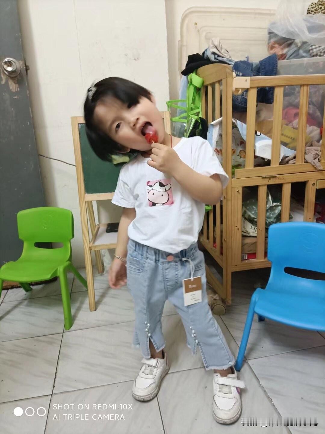 夏日午后,屋内洒满阳光。一个小女孩穿着白色卡通T恤和牛仔裤,手里拿着一颗红色的棒棒糖,脸上洋溢着幸福的笑容。她身旁是绿色和蓝色的小椅子,还有一个小黑板,似乎是她的小天地。这个画面充满了童真与温暖,让人感受到生活的美好与简单。