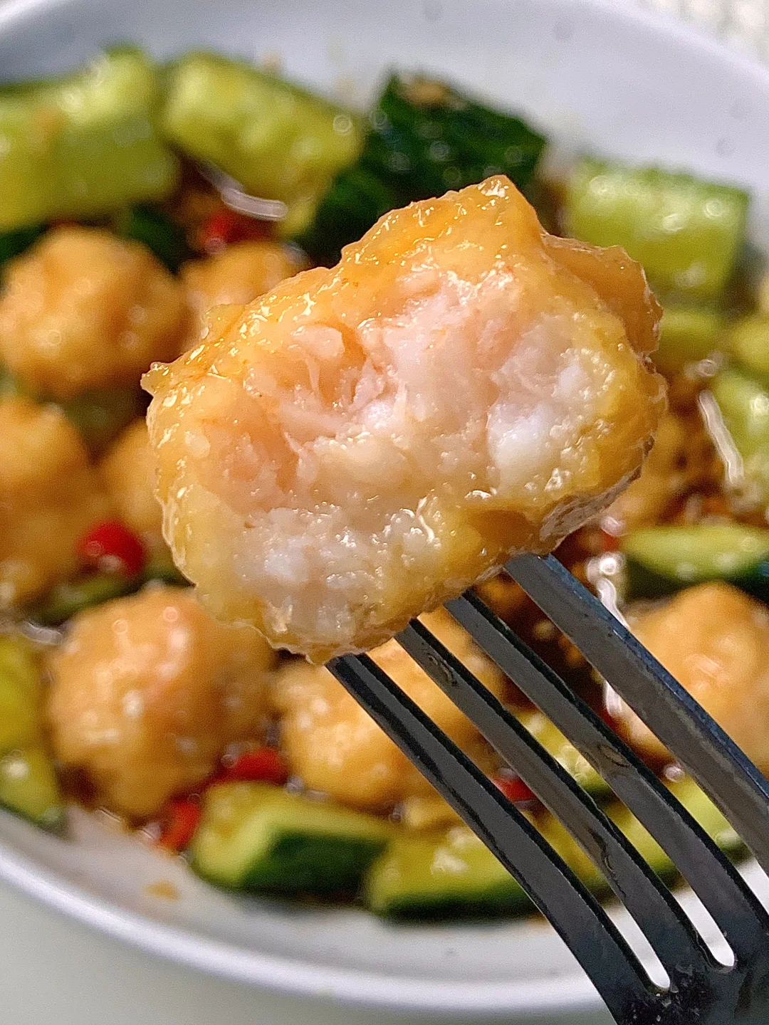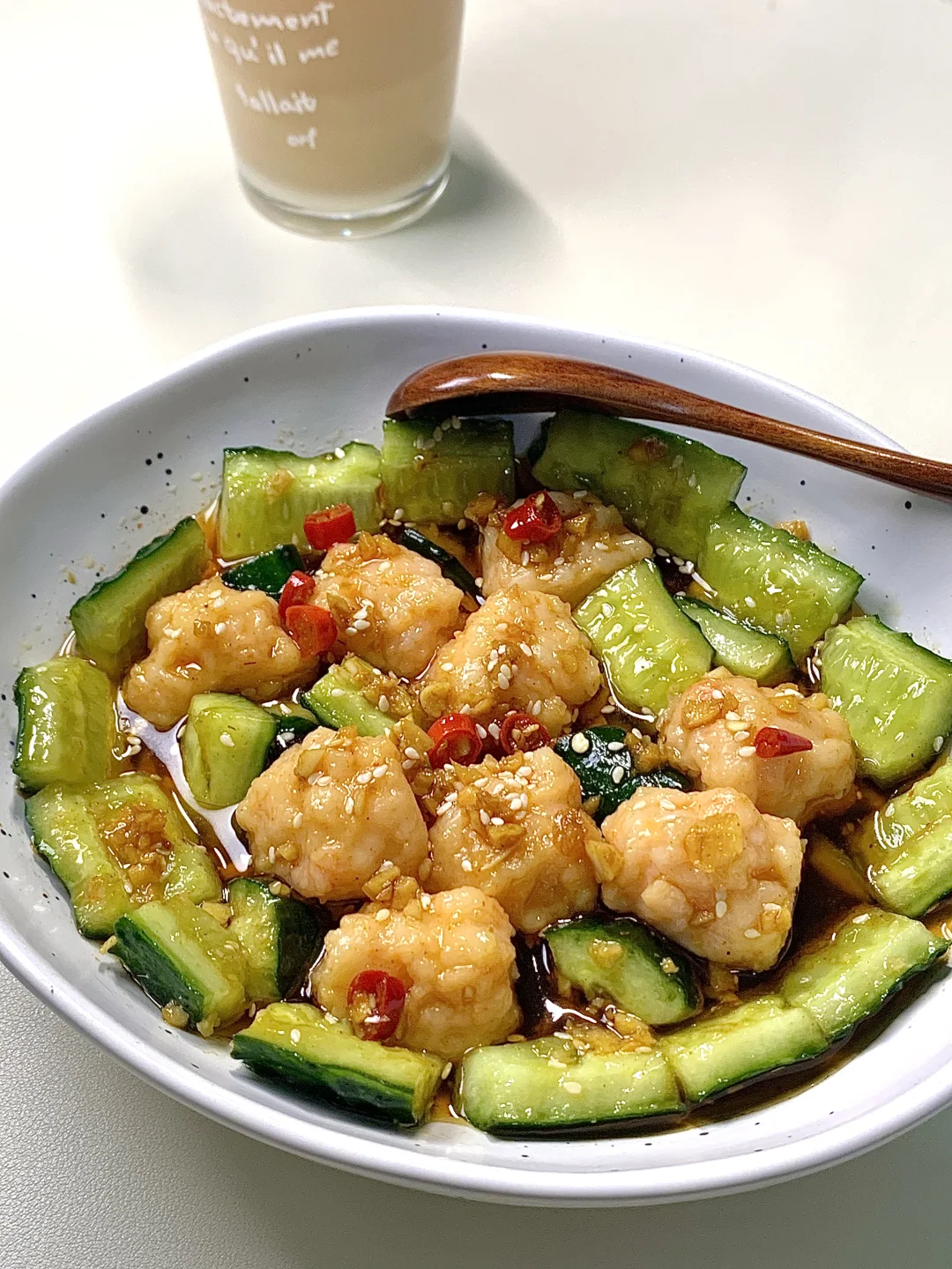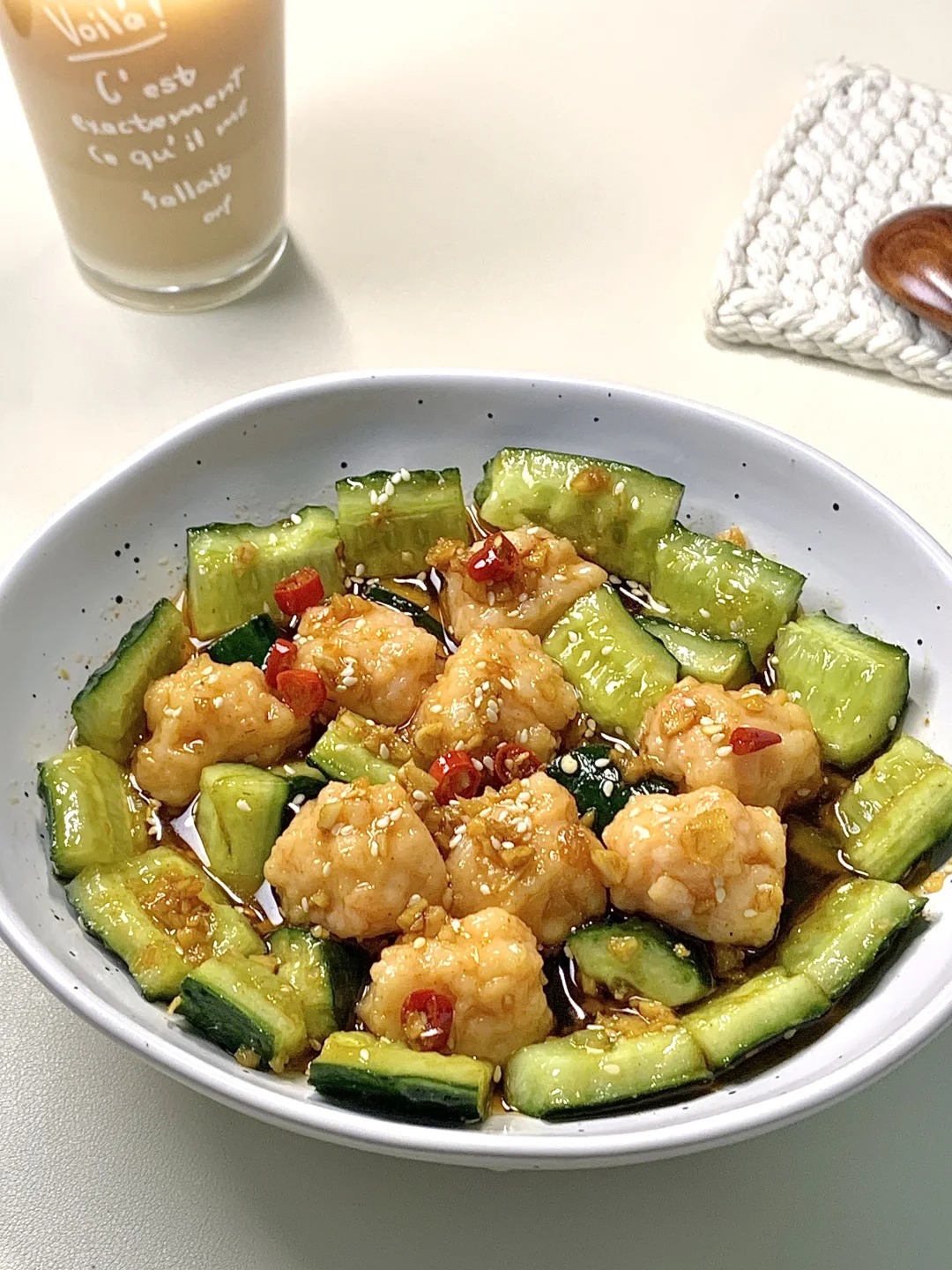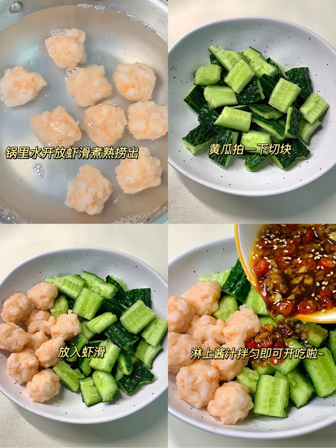 10分钟搞定虾滑黄瓜凉拌,凉拌虾球黄瓜天天吃都不够,黄清脆好吃,虾球Q弹鲜美高蛋白,淋上自制酱汁,吃起来绝了! 🥒食材准备:虾滑、黄瓜 🫕做法: 虾滑提前解冻搓成小球,水开放入虾球煮熟捞出过凉白开更Q弹 [飞吻R]调酱汁:碗里放入蒜未小米辣 热油激发香味,放入两勺生抽+一勺蚝油+一勺醋少许代糖和盐+2勺凉白开拌 [派对R]这个搭配姐妹们真的要试一试~黄瓜搭配虾滑别提多鲜美爽口啦!去试试吧~