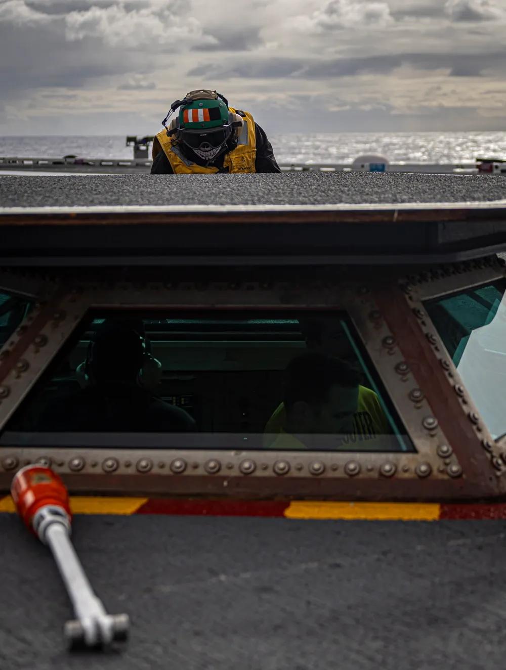 美军航空水手(设备)二等兵约书亚·胡科(Joshua Juco)隶属于美国航空母舰——杰拉尔德·R·福特号(USS Gerald R. Ford, CVN 78)航空部门,在飞行作业期间在舰首气泡舱与甲板上舰载机管理员们交流。