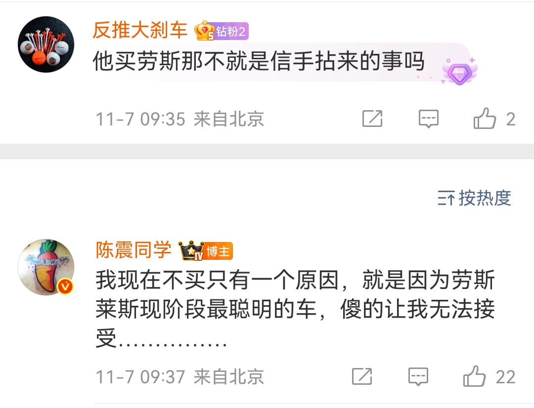陈震:FSD好了和我买不买劳斯莱斯有什么关系?[what] 陈震: 我现在不买只有一个原因,就是因为劳斯莱斯现阶段最聪明的车,傻的让我无法接受…………… 陈震买劳斯莱斯真的是非常的简单,他只需要出去几趟,就能挣到买劳斯莱斯的钱了。 陈震挣钱的能力应该已经超过了全国99.999%的人吧,其他的车评人根本就达不到这么高的收入,或者其他车评人都需要通过其他业务增加收入。 各位是怎么看的?欢迎评论区留言。