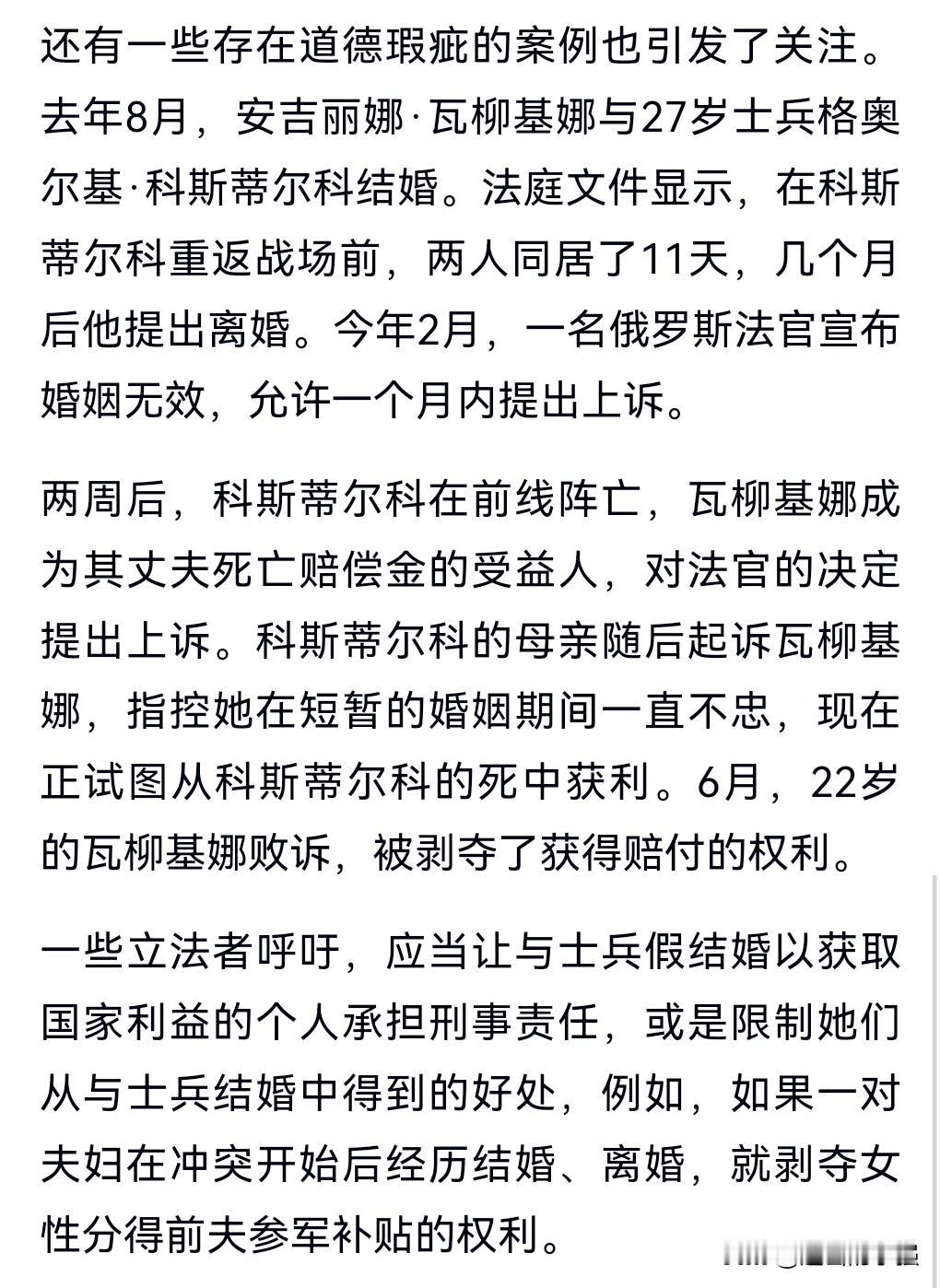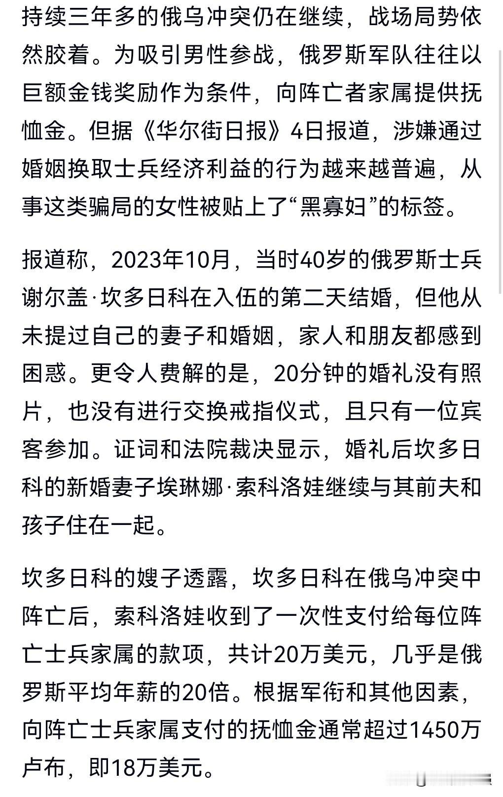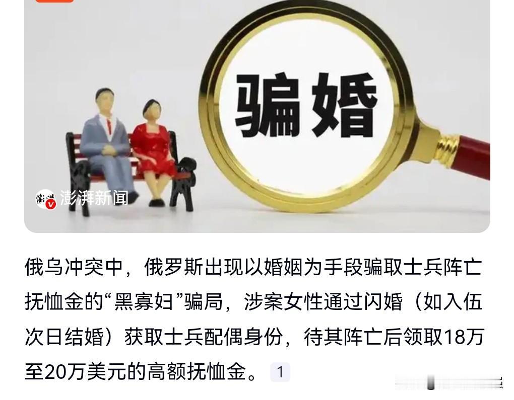 这真是人心叵测,让人防不胜防啊。 俄罗斯的“黑寡妇”已经盯上了阵亡士兵的抚恤金。 和这些士兵结婚,然后士兵如果阵亡了,就领取赔偿金。 这样的行为实在是太不道德了。 并不是出于爱情,而是出于利益闪婚俄士兵。 盼着丈夫死,然后领钱,多么的邪恶。
