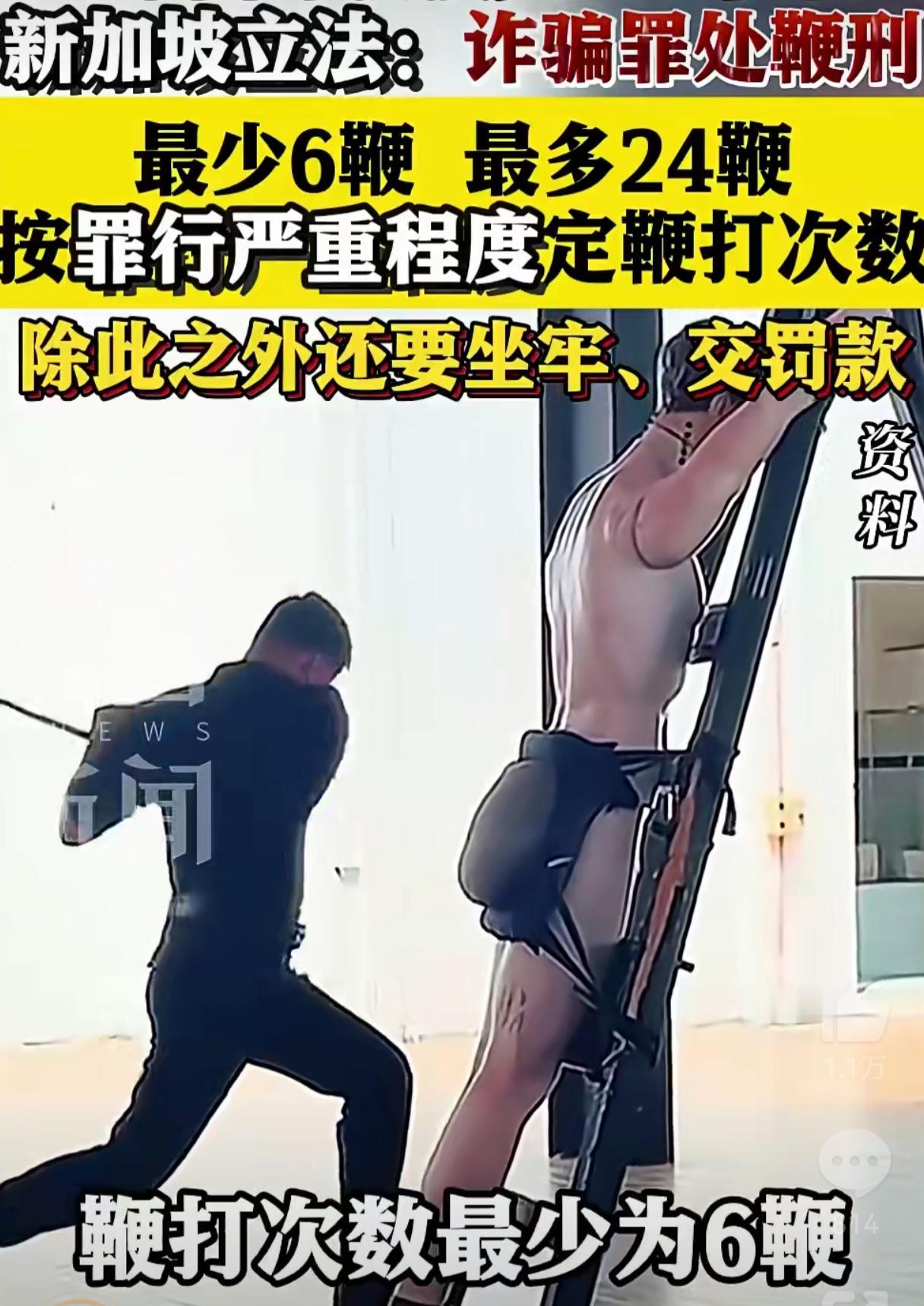 11月4日,新加坡议会通过新法律,只要沾了诈骗的边,不管是主谋、帮凶还是牵线的,都可能挨鞭子。鞭打次数最少为6鞭,最多为24鞭。目前新加坡的司法鞭刑只适用于50岁以下、身体健康的男性罪犯。 为新加坡叫好,感觉应该让缅甸、柬埔寨那帮搞电诈的先体验下。 鞭刑表演