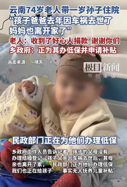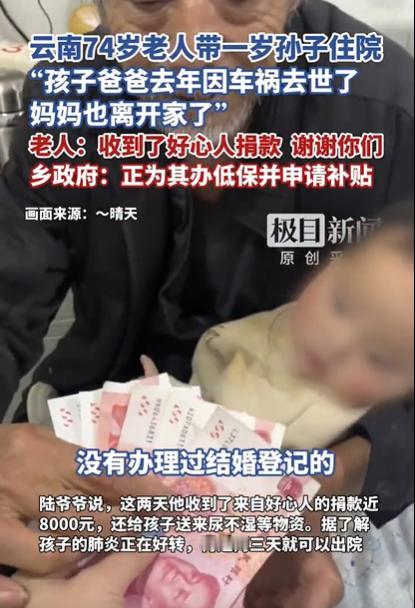 这妈为啥这么狠心?云南一男子车祸去世,妻子竟然不顾1岁孩子,独自离去!自此了无音讯,眼看孩子肺炎越来越严重,70岁爷爷没有放弃,揣着几千块钱,带着孩子去医院住院,被好心人看到后,发到网上引起了共鸣,不仅看哭了网友,也发起了一场爱心接力。 云南偏远山村的县医院走廊里,七十岁的郭老汉(化名)佝偻着背。 怀里抱着一岁的孙儿,孩子小脸憋得通红,一声声咳嗽像小锤子敲在老人心上。 老人的手止不住地颤抖,端着药碗的动作小心翼翼。 药汁晃悠着险些洒出,他却不敢停下,只顾着哄怀里的孩子。 谁能想到,几个月前,这个家还是完整的。 郭老汉的儿子在工地干活时意外身亡,家里的顶梁柱轰然倒塌。 更让人寒心的是,年轻的儿媳料理完后事。 就收拾行李走了,再也没回来过,留下嗷嗷待哺的幼孙。 面对襁褓中的孩子,郭老汉没半点犹豫。 他擦干眼泪,扛起了养育孙儿的重任,成了孩子唯一的依靠。 可天有不测风云,孩子突然染上肺炎,高烧不退。 郭老汉没敢耽误,连夜取出攒了一辈子的积蓄。 揣着皱巴巴的钱,抱着孙儿,一步步走向几十里外的县医院。 医院里,这对特殊的祖孙吸引了大家的注意。 得知他们的遭遇后,素不相识的人们纷纷伸出援手。 有个大姐悄悄去缴费窗口,帮他们垫付了部分医药费。 隔壁病床的家属送来奶粉和尿不湿,说孩子正是长身体的时候。 本地一家母婴店老板听说后,亲自开车送来整箱婴幼儿用品。 从衣服到玩具,样样齐全,还反复叮嘱老人有困难就说。 这些温暖的举动,让原本冷清的病房变得热闹起来。 郭老汉拉着大家的手,一遍遍说着 “谢谢”,眼眶始终红红的。 当地政府听说了这个情况,也很快介入。 工作人员主动上门,帮祖孙二人办理了低保手续。 还启动了临时救助,解决了后续的生活难题。 医院方面也格外照顾,主动减免了部分医疗费用。 医生护士更是时常来看望,细心叮嘱护理注意事项。 在多方关爱下,孩子的病情慢慢好转。 原本嘶哑的咳嗽声渐渐减轻,小脸也恢复了红润。 这个感人的故事传到网上后,瞬间引发全网关注。 无数网友被郭老汉不离不弃的爱打动,更被陌生人的善意温暖。 “老人太不容易了,白发人送黑发人,还要照顾小的”。 “这个世界还是好人多,陌生人的善意最治愈人心”。 社会学专家说,现在基层救助越来越完善了。 民间爱心加上政府保障,就算遭遇变故,弱势群体也能有依靠。 他还呼吁,要让农村地区的儿童福利更完善。 让每个孩子都能在关爱中长大,不用再面临这样的困境。 如今,孩子已经康复出院,跟着郭老汉回了家。 老人说,他最大的愿望就是看着孙儿健康长大。 将来做个懂得感恩的人,把这份善意传递下去。 这个平凡的故事,藏着最动人的力量。 有老人的责任与坚守,有陌生人的善意与温暖。 还有社会的兜底与关怀,让绝望中开出了希望的花。 你被这份跨越陌生的善意打动了吗? 如果遇到这样的情况,你会伸出援手吗? 对此,你有什么看法呢? 信息来源:极目新闻
