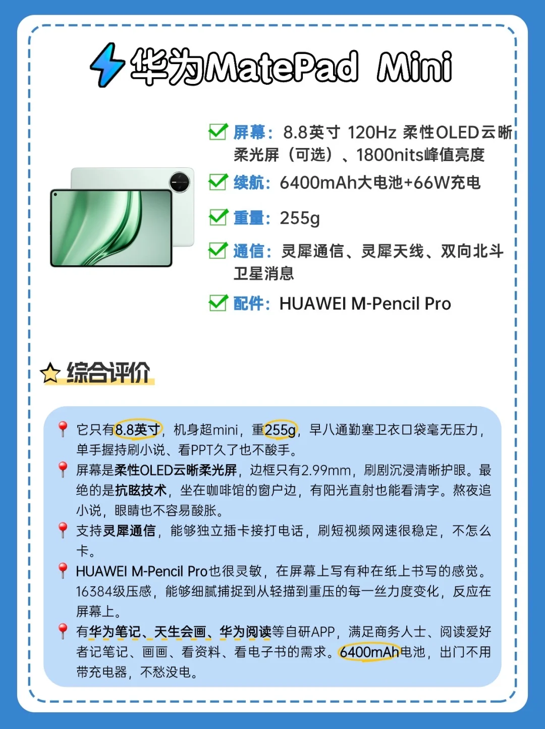 总之从屏幕素质、通信能力、便携性等方面来说,华为MatePad Mini更出色。既是一台小巧便携的平板,轻办公生活场景轻松覆盖,也是一部支持通话的大号手机。随行好搭子,闭眼入!