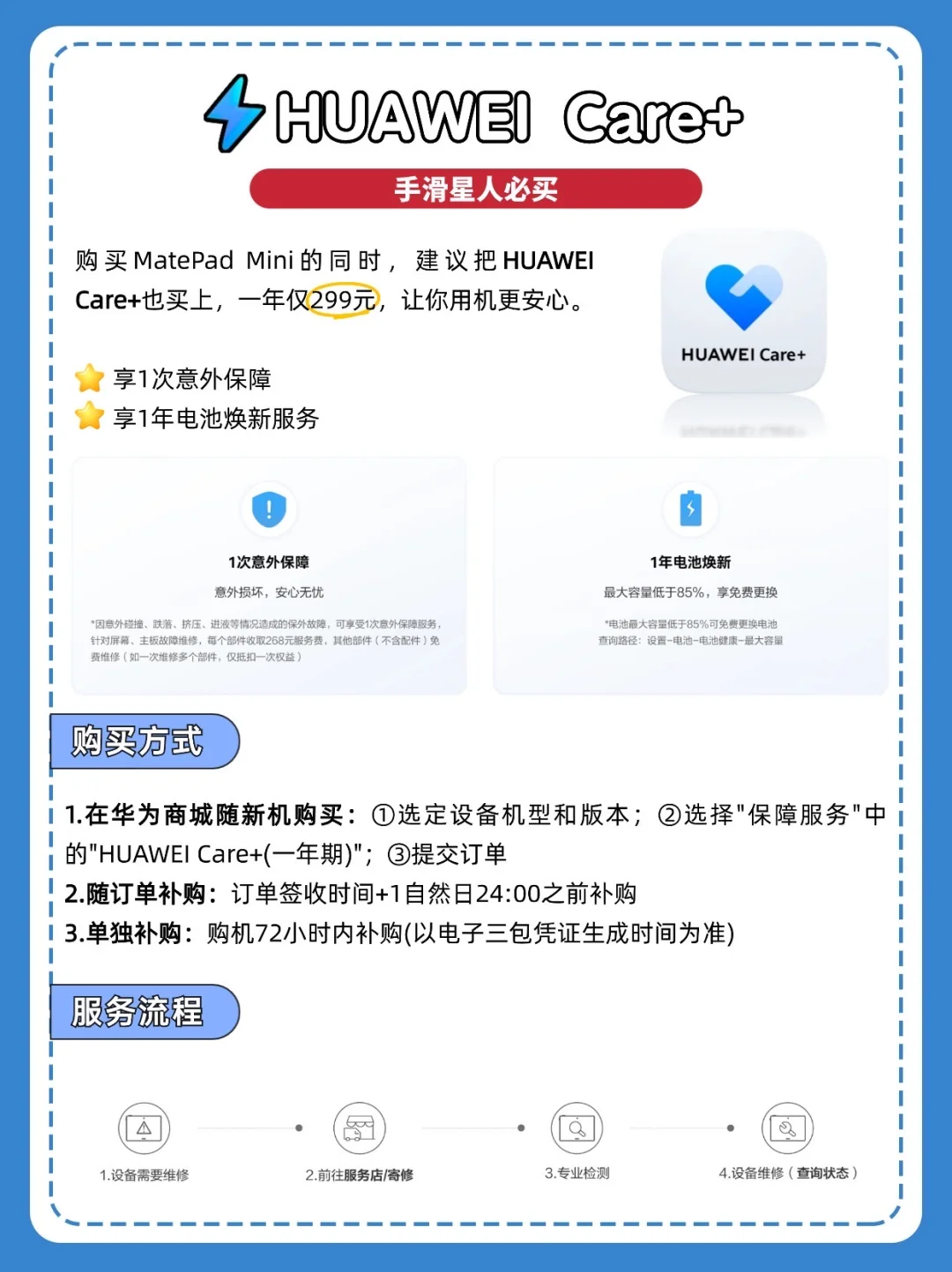容易手滑的建议把HUAWEI Care+安排上,一年299元,享1次意外保障和1年电池焕新服务,这样就不用小心翼翼地用平板啦。