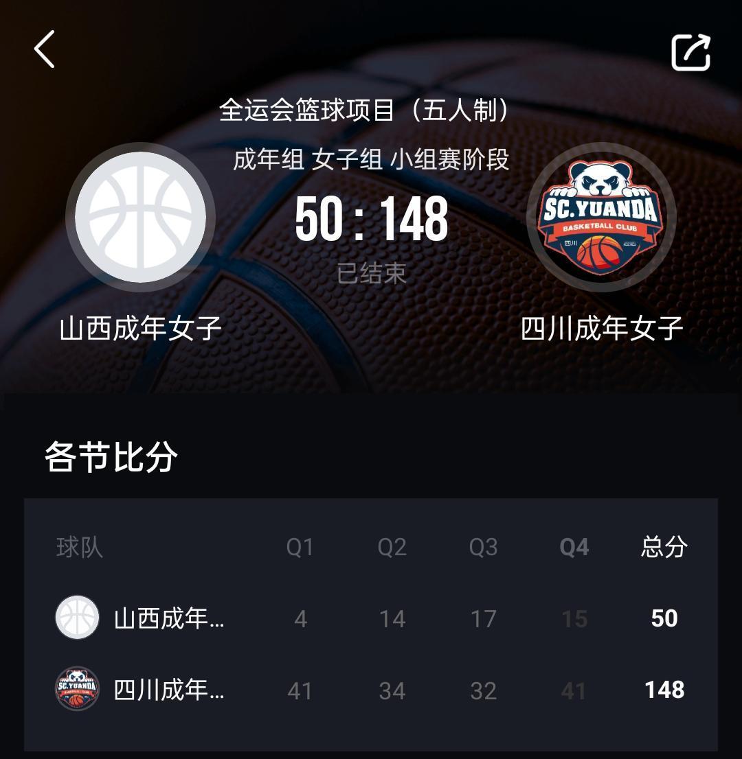 全运会女篮小组赛, 四川女篮148—50山西女篮, 比赛第一节就决出了胜负, 四川女篮41-4山西女篮, 两队全场失误比36-8, 王思雨休战, 四川女篮还只上场两巨头, 李梦跟韩旭, 李梦正在进入全运节奏, 状态肉眼可见的好, 四川女篮用抢断, 赢下了年轻的山西女篮, 翟若云独木难支, 撑不起山西全队, 实力差距,分差比较大,也算正常。